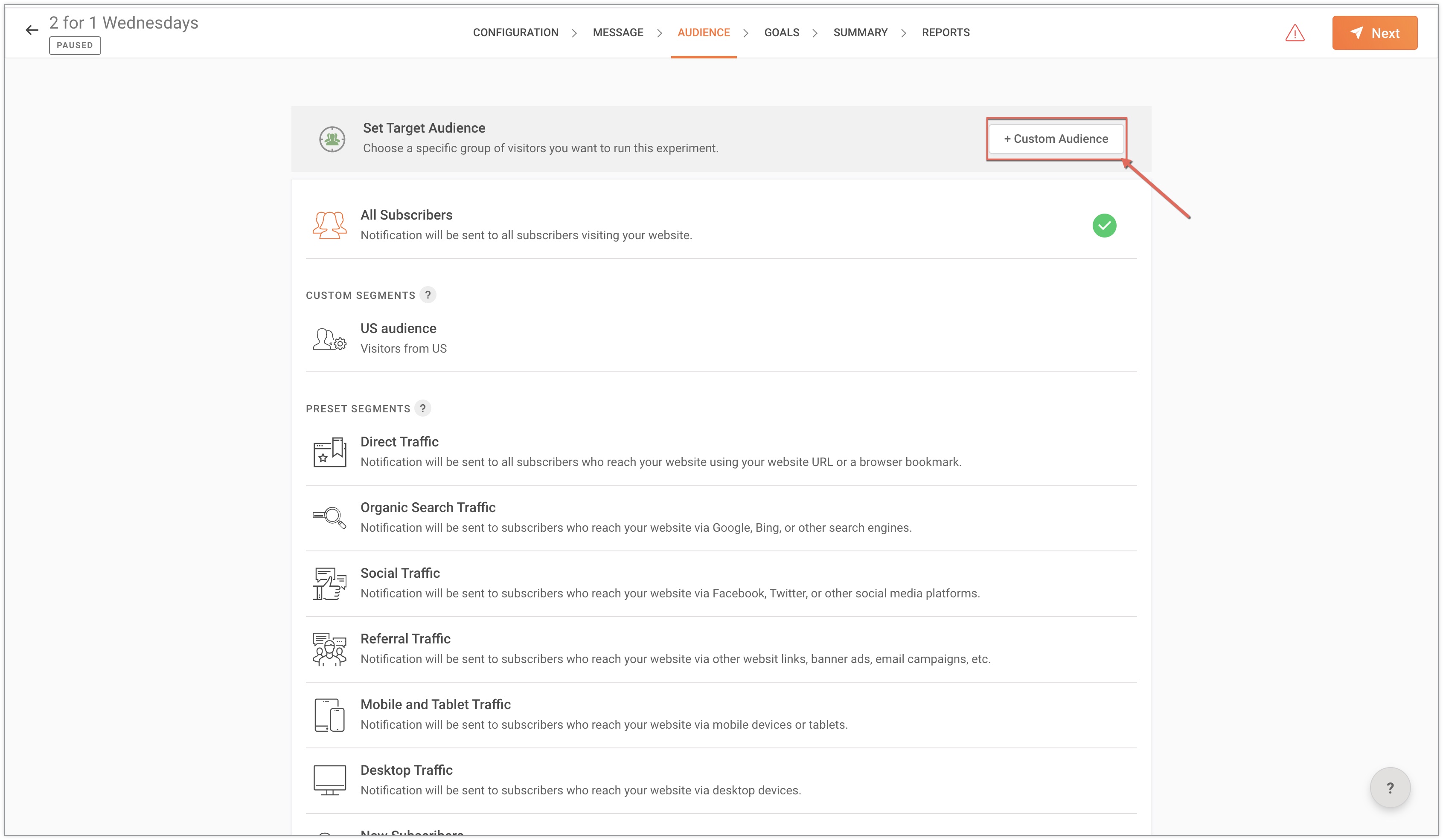 Go to the AUDIENCE tab of your push notification, choose the type of visitors you want to show the notification to on their browse and click Next. Zoho PageSense provides the following types of audience segments: