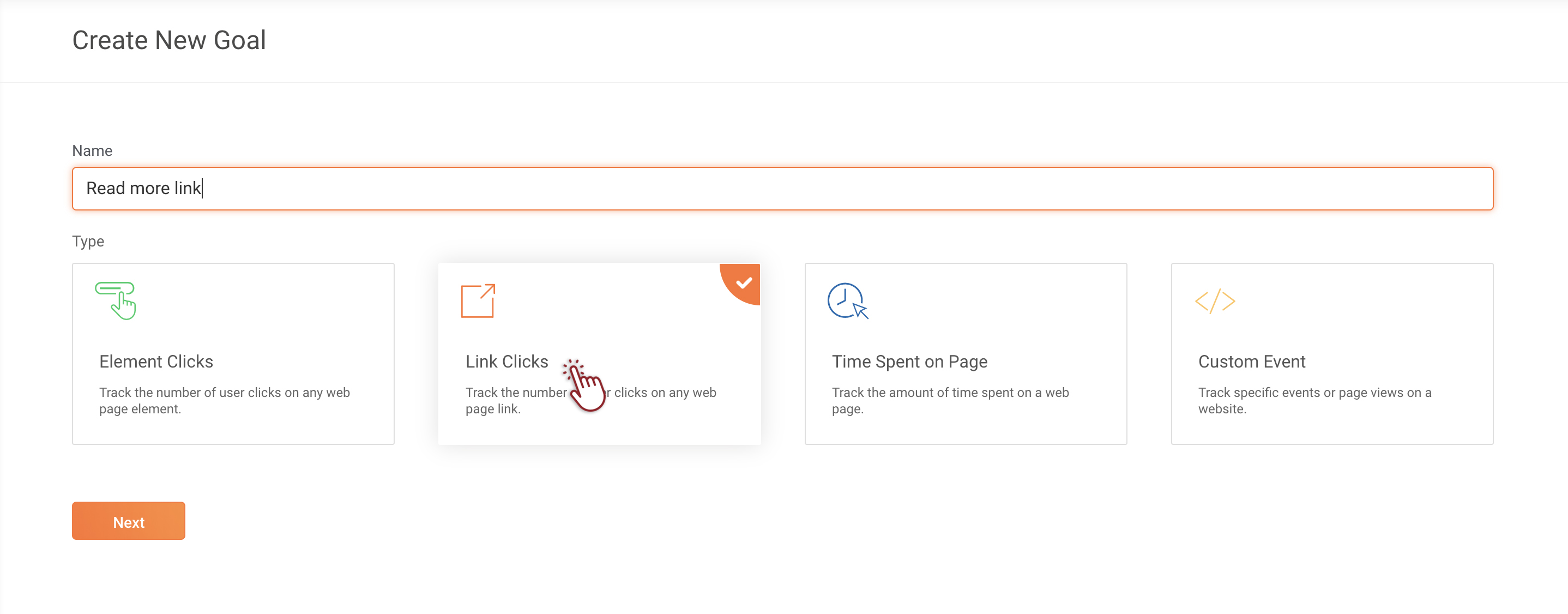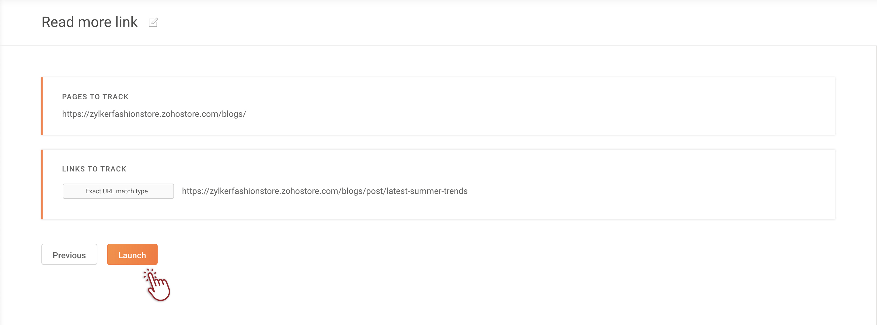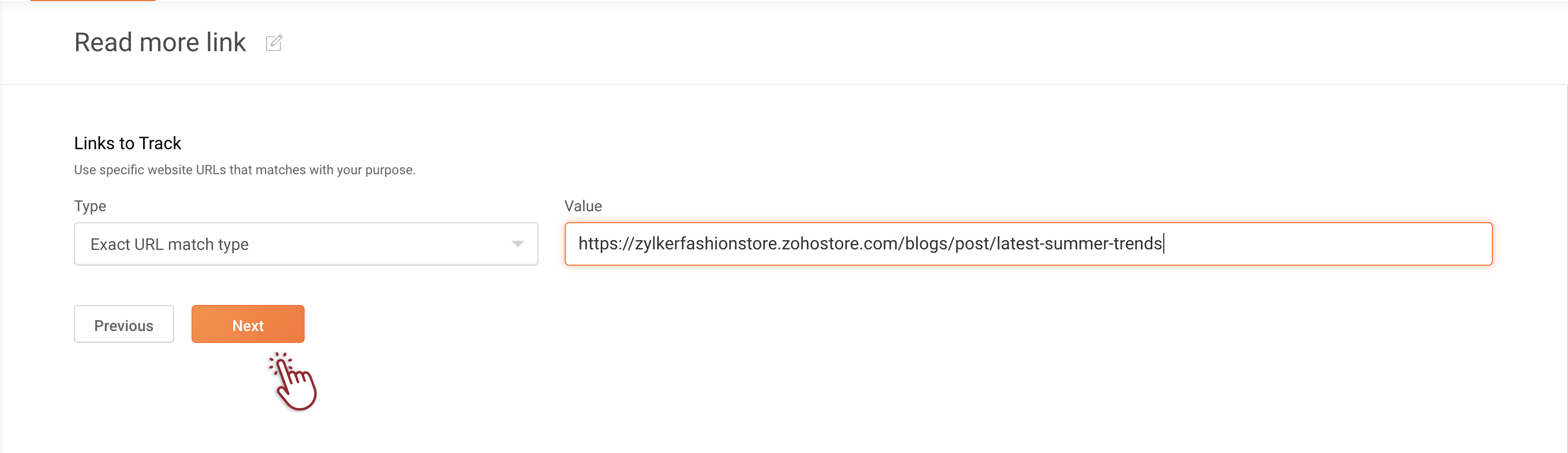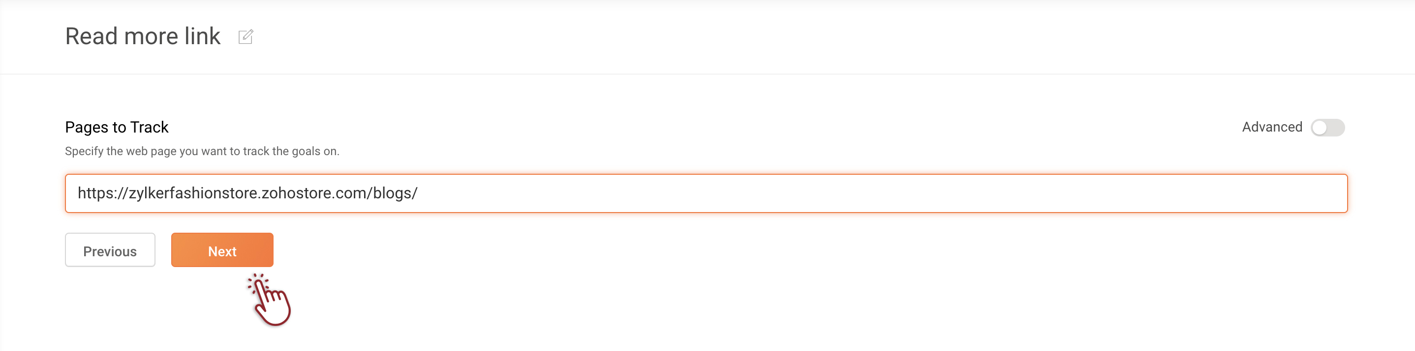 You can create a goal to track when someone clicks a link on your website. In this goal type, clicking on the link usually leads the user to a different web page. For example, you can track when someone clicks the 'Buy Now' link on your product page, which will take visitors to the cart or checkout page of your shopping site. Whenever a visitor clicks on this link, PageSense will track that as a conversion. However, even if the same visitor clicks on the button multiple times, the conversion count will remain as one.