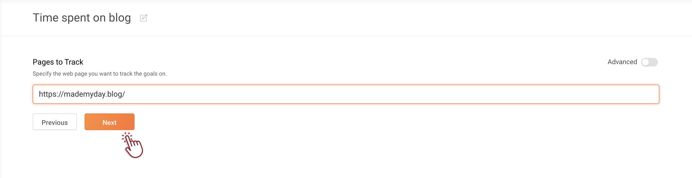 You can also track the time spent by visitors across multiple target pages by enabling the Advanced button. This option also allows you to use different URL match types, and further include or exclude a group of web pages from being tracked.