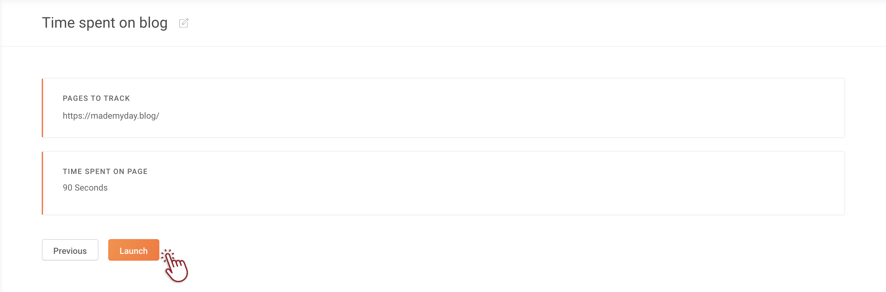 You can track the amount of time spent by your visitors on your web page using the Time Spent on Page goal in PageSense. This goal allows you to track the conversion rate whenever a visitor exceeds the set time frame (in seconds) on the page. For example, say you want to check whether visitors read the latest exercise tips on your fitness website. You can set the time spent on page goal to be greater than 120 seconds, assuming this is how long it takes to get the gist of your article. This way, you can track it as a conversation if the visitor stays on the page for more than two minutes.