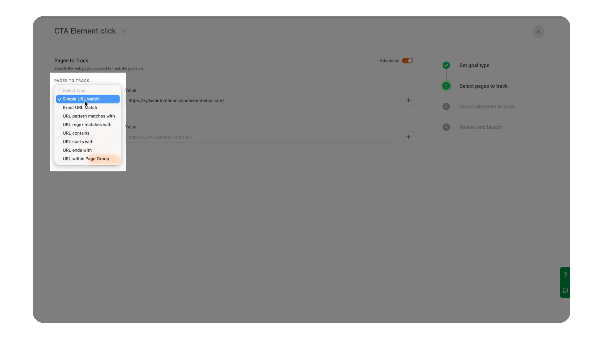 Matches with | For flexible partial matching | https://zylkerautomation.zohocommerce.com/offer | Tracks URL matching similar patterns |