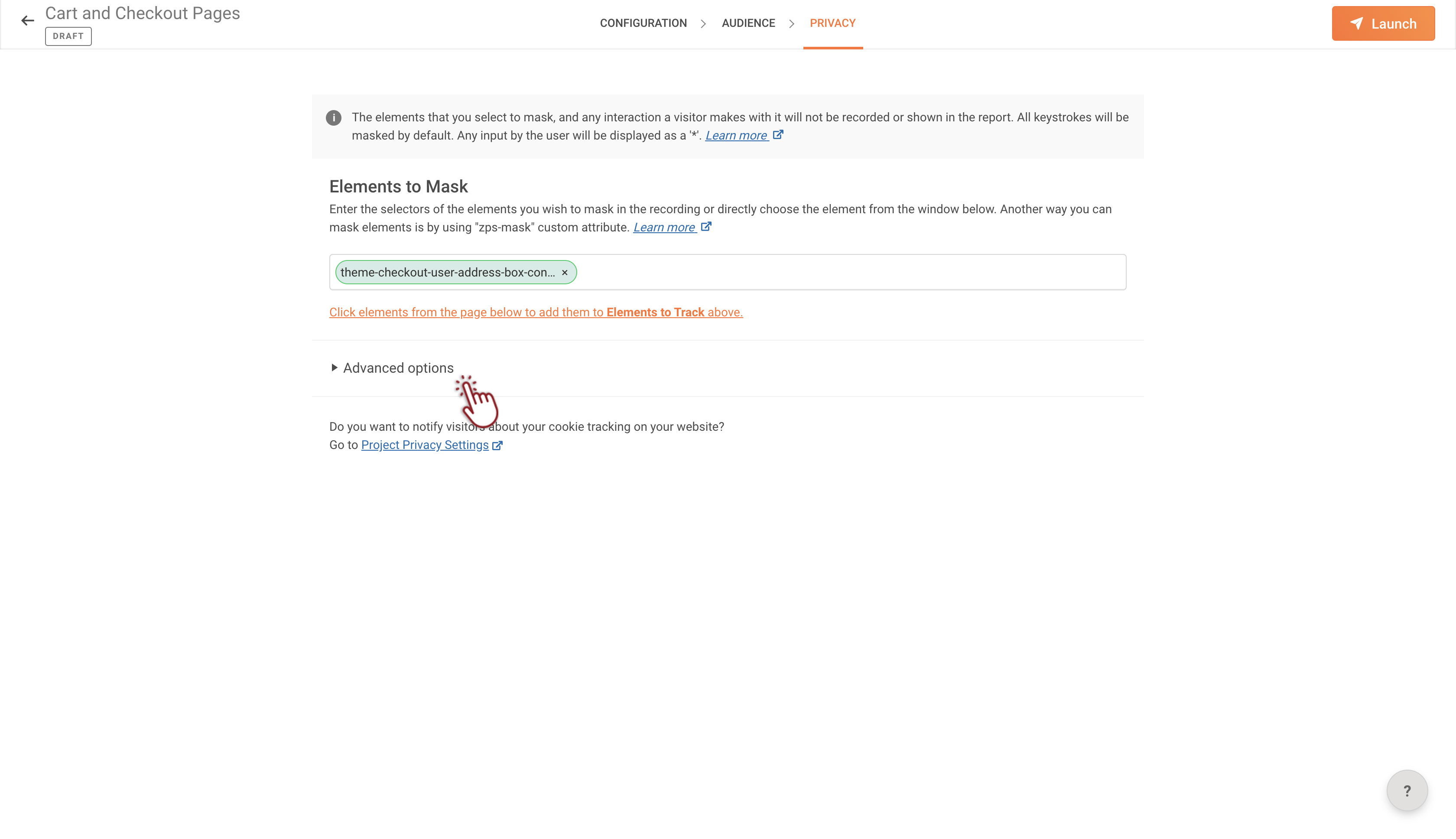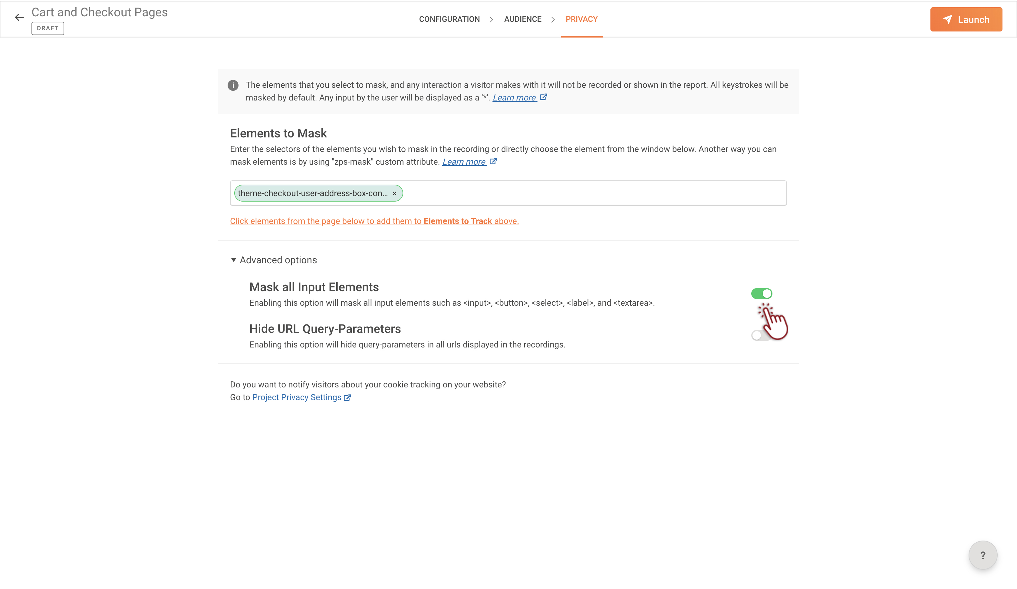 6. Click Next to navigate to the PRIVACY tab, then enter the selector IDs of the elements you wish to mask in recordings within the Elements to Mask text box. You can add multiple selector IDs for elements across the page.