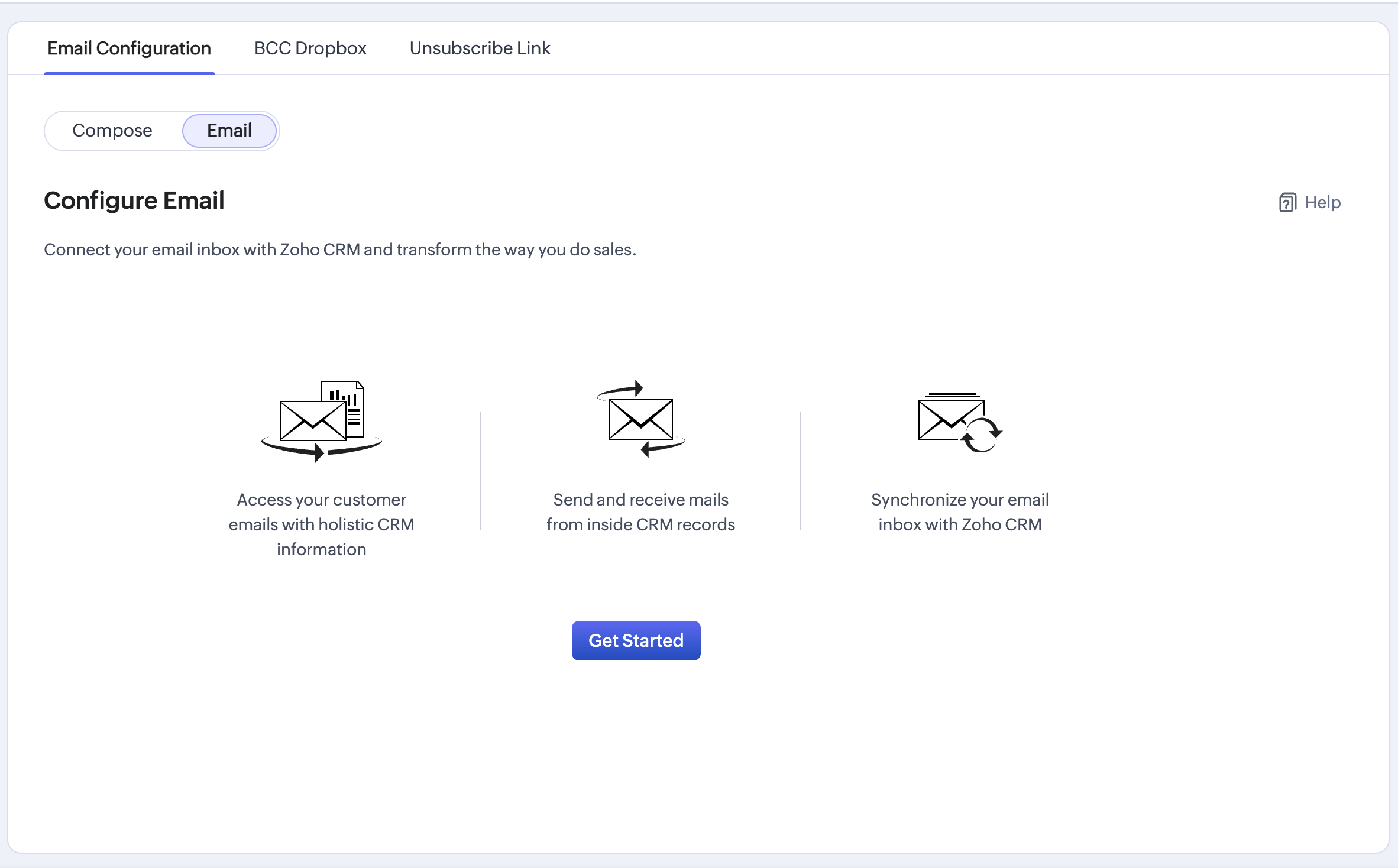 Navigate to Setup (⚙️) in Zoho CRM → Channel → Email → Email configuration → Email → Click on Get started → select the email service → Configure