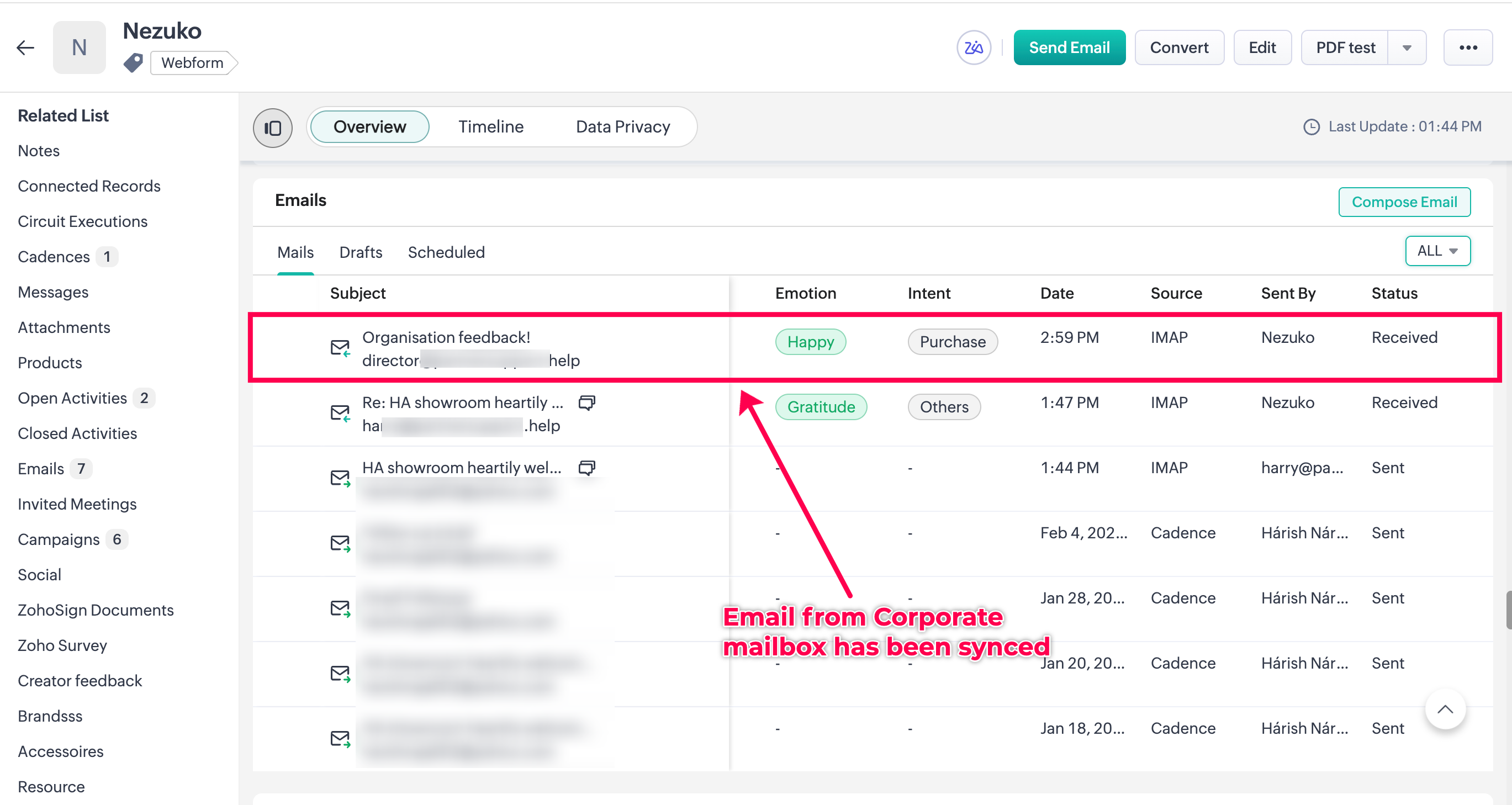 3. Forwarded email has been synced with CRM record