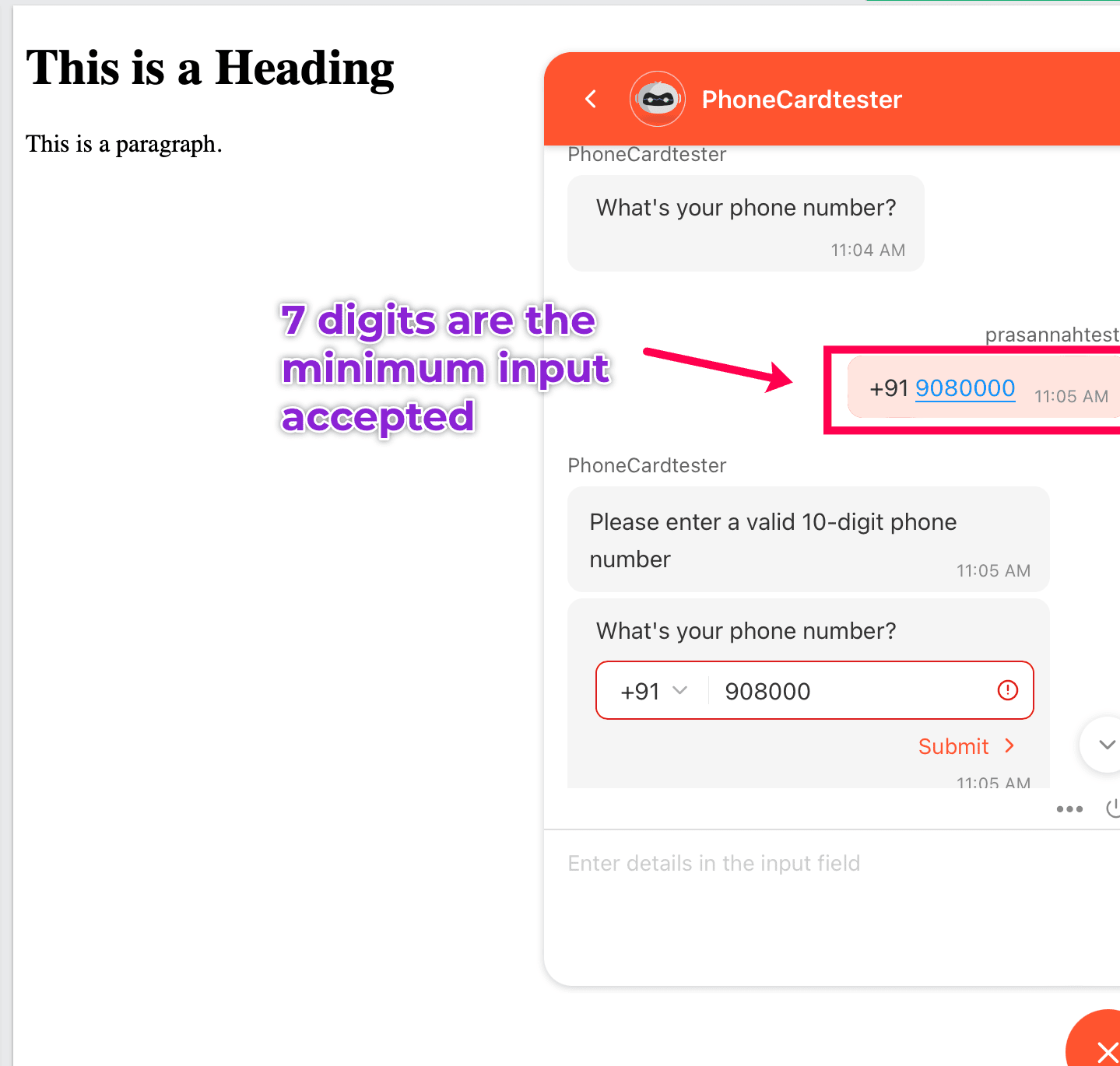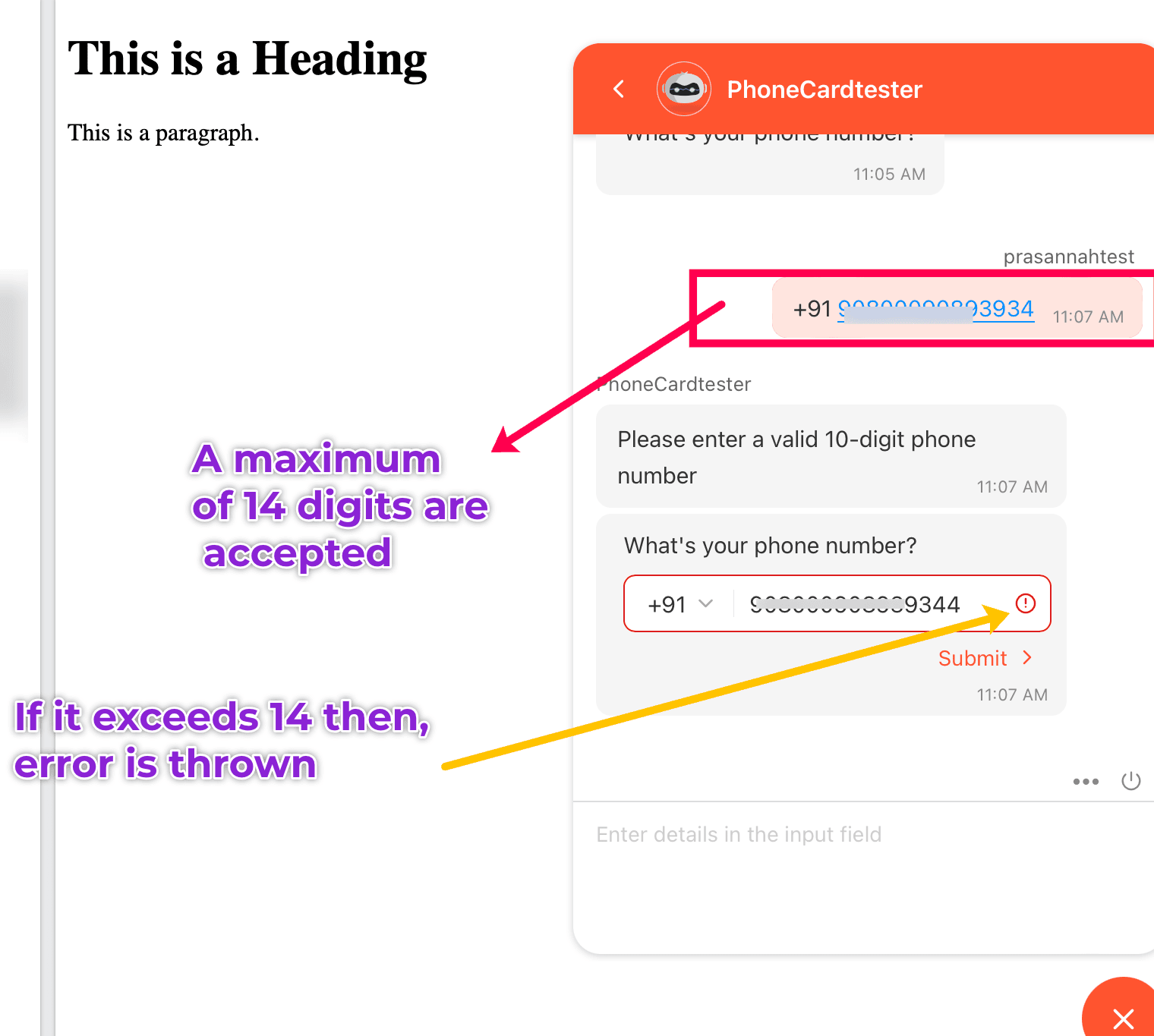 While the Phone card has basic validation, it does not natively enforce specific digit limits (e.g., exactly 10 digits for Indian numbers). We cannot restrict visitors' ability to enter the required number of numbers in accordance with your geographical standards, To handle this, you can implement a workaround using: