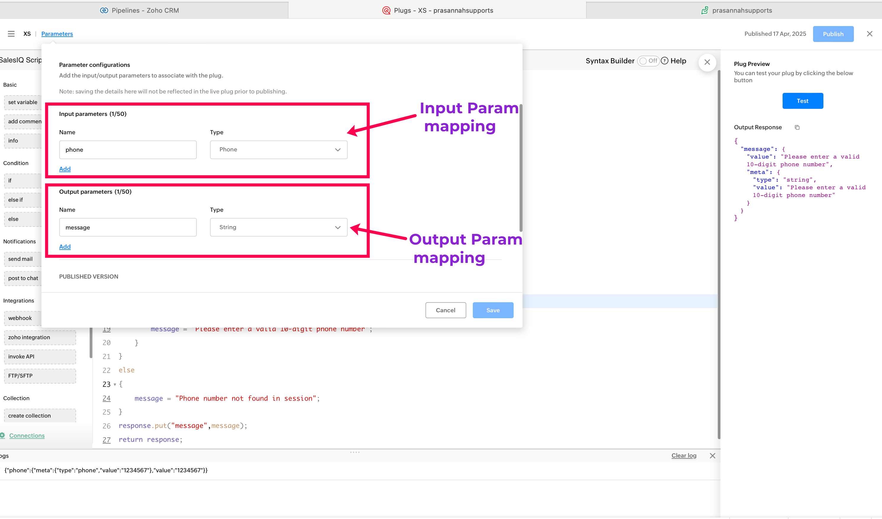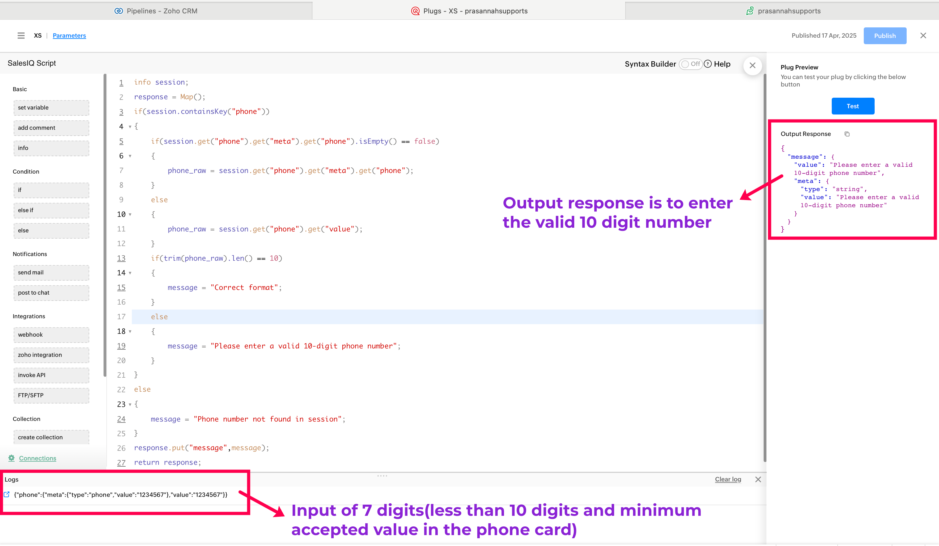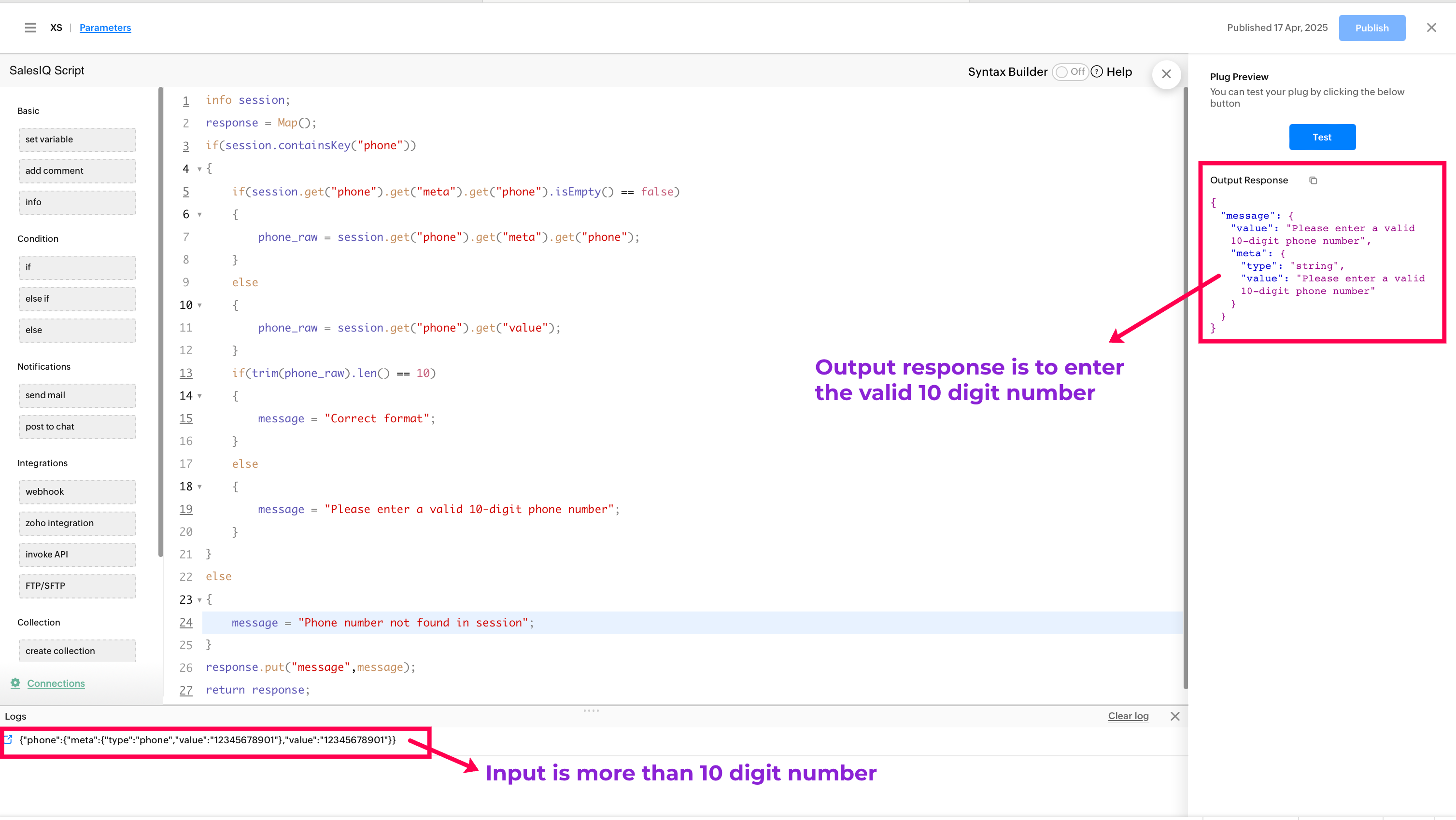 In the script-based plug, we can incorporate a Deluge script to validate the length of the phone number obtained as an input parameter.