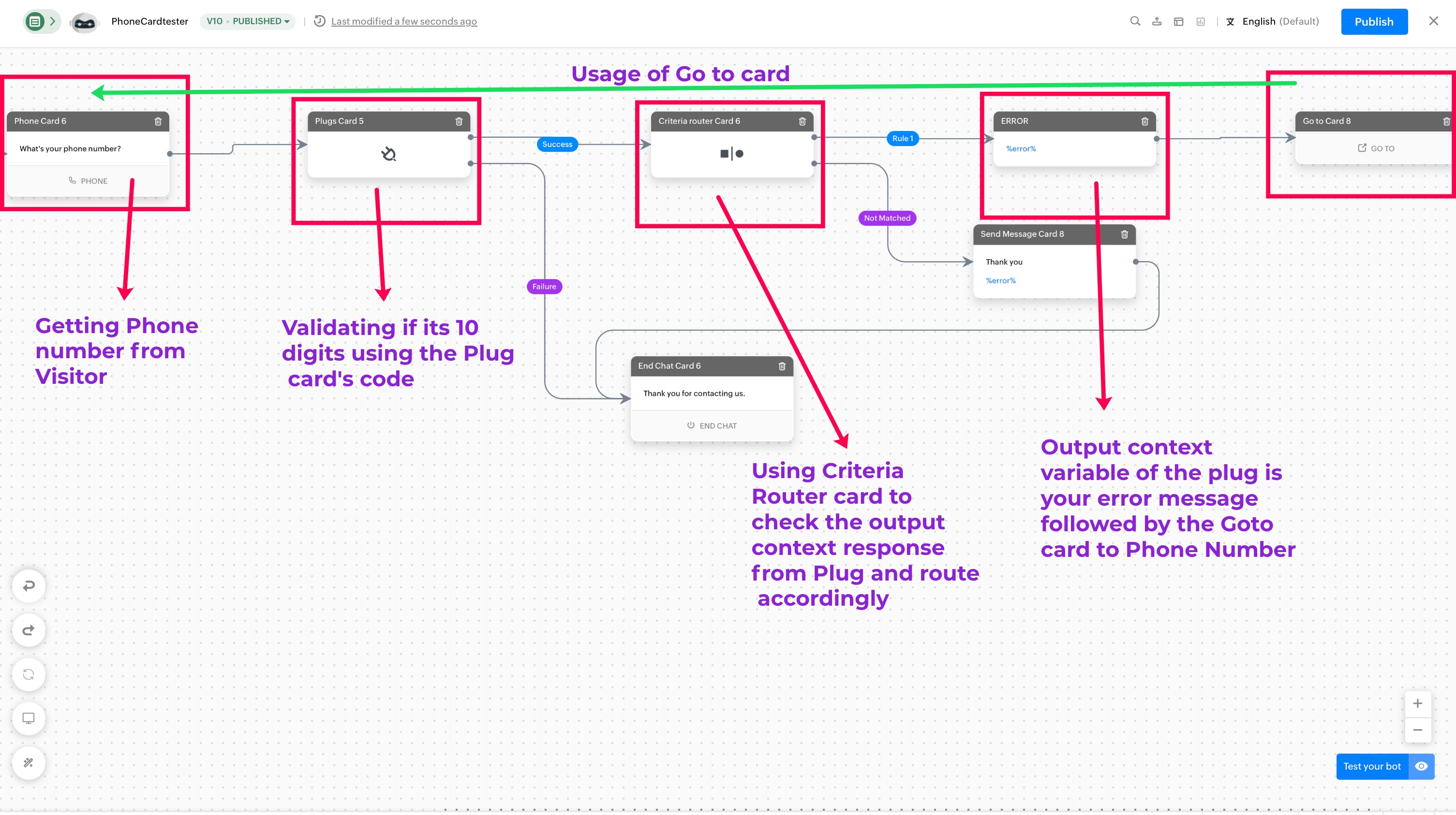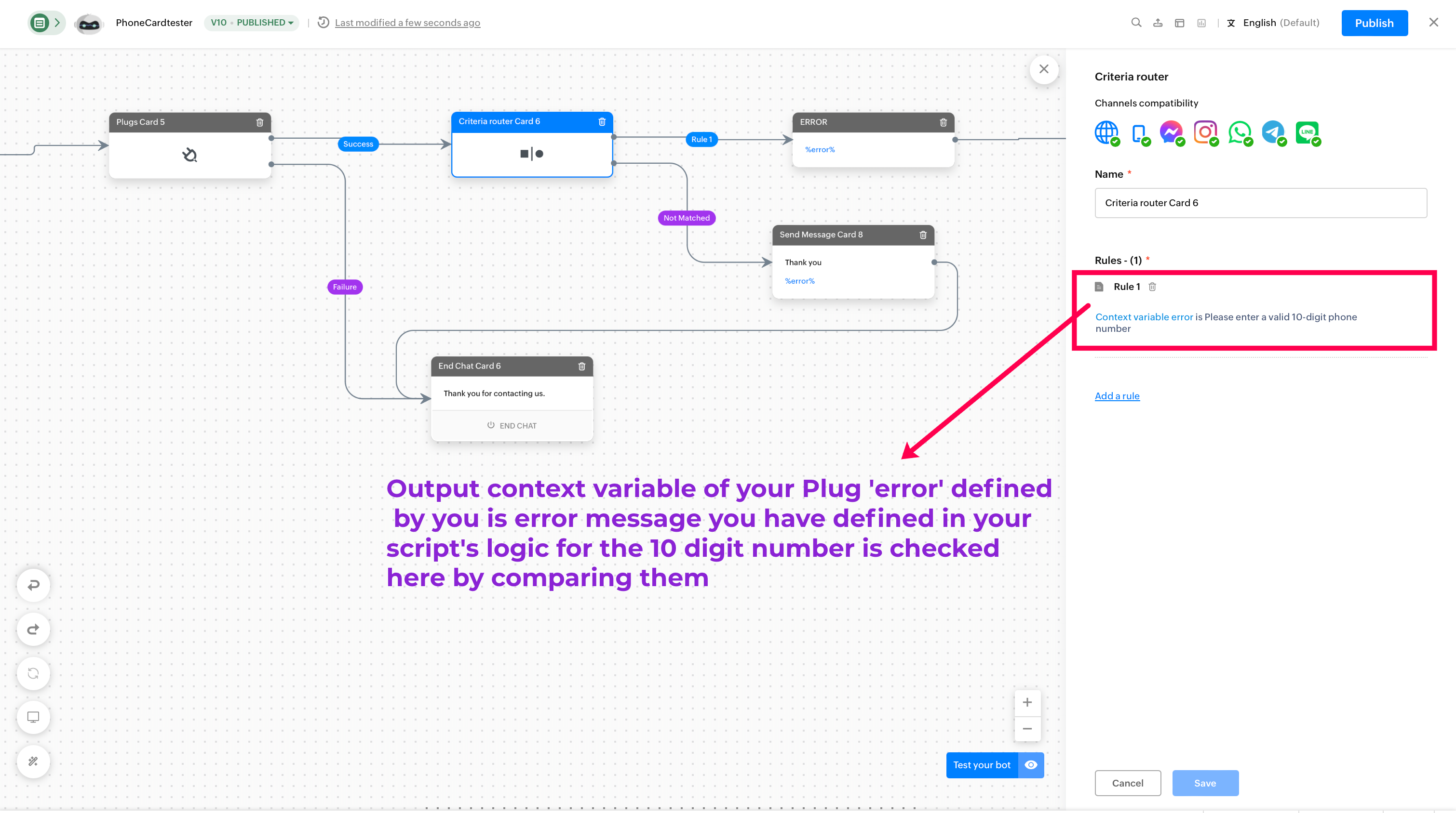 In this case, the script checks the length of the phone number and returns a text string as the output. This output is then stored as a context variable in the bot, which is subsequently used in the criteria router card to route users based on the returned value.