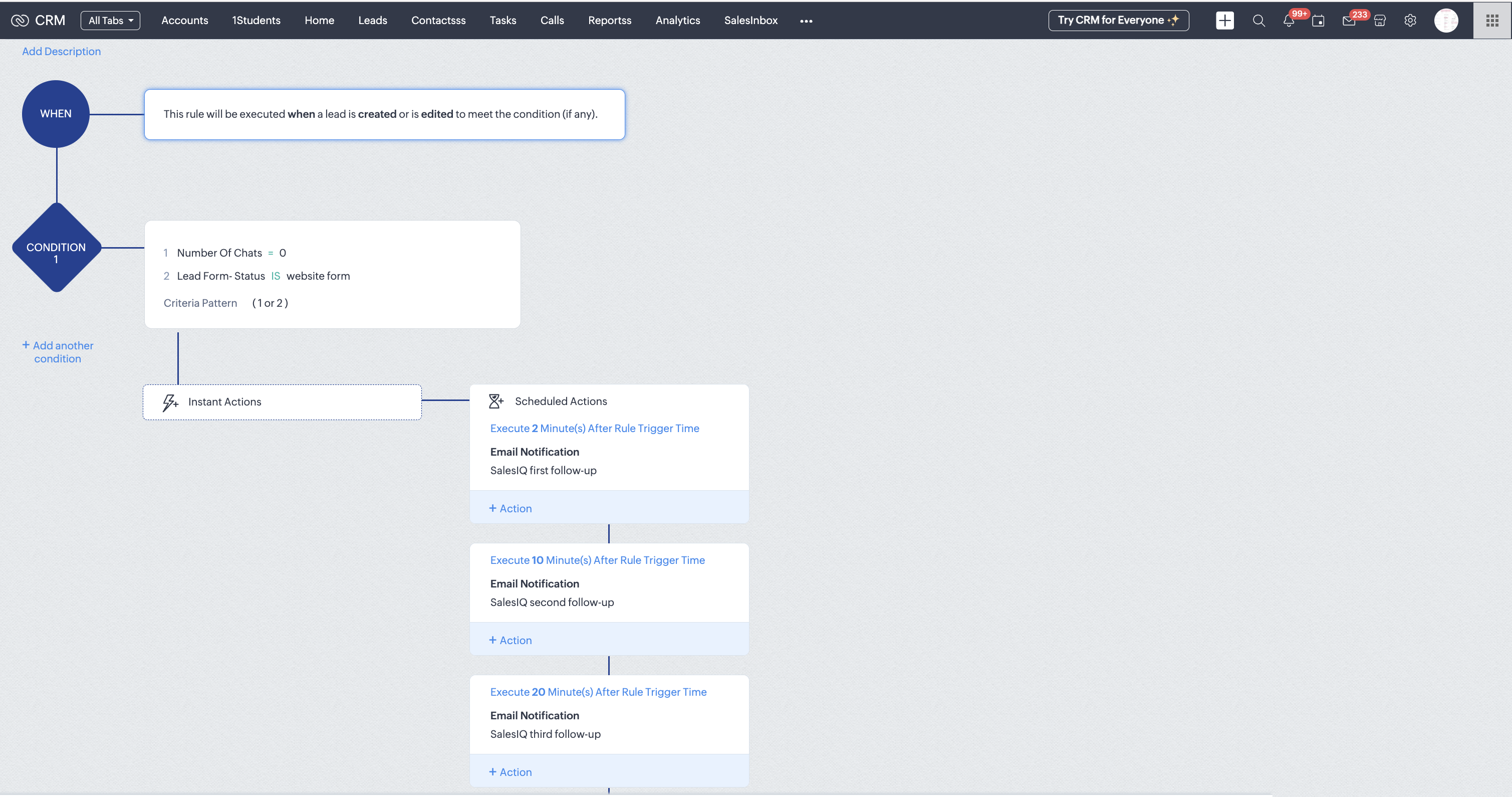 Now, create a Workflow Rule to trigger whenever Lead record is created/edited. Then, select "Email Notification" as actions under "Scheduled Action" to send consecutive follow-up emails to leads.