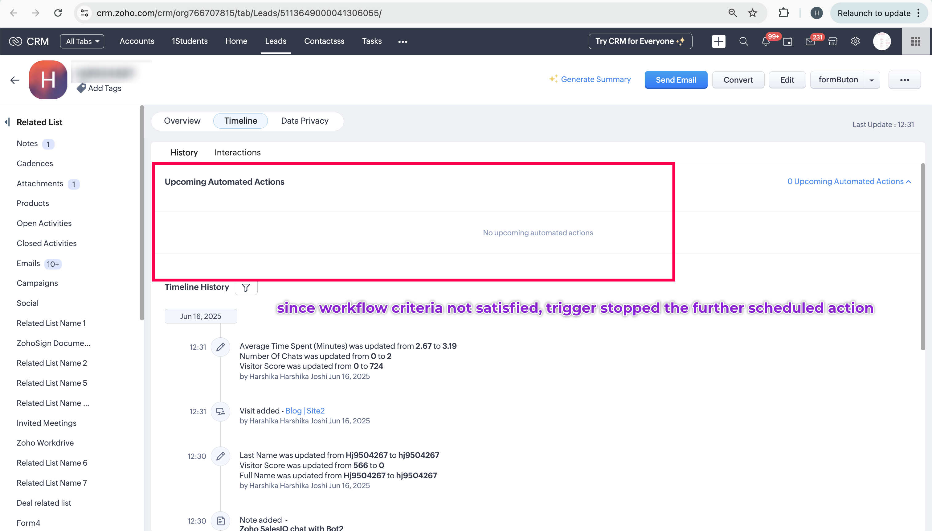 -> Now, in CRM lead record, workflow rule will be triggered and start sending a follow-up emails.