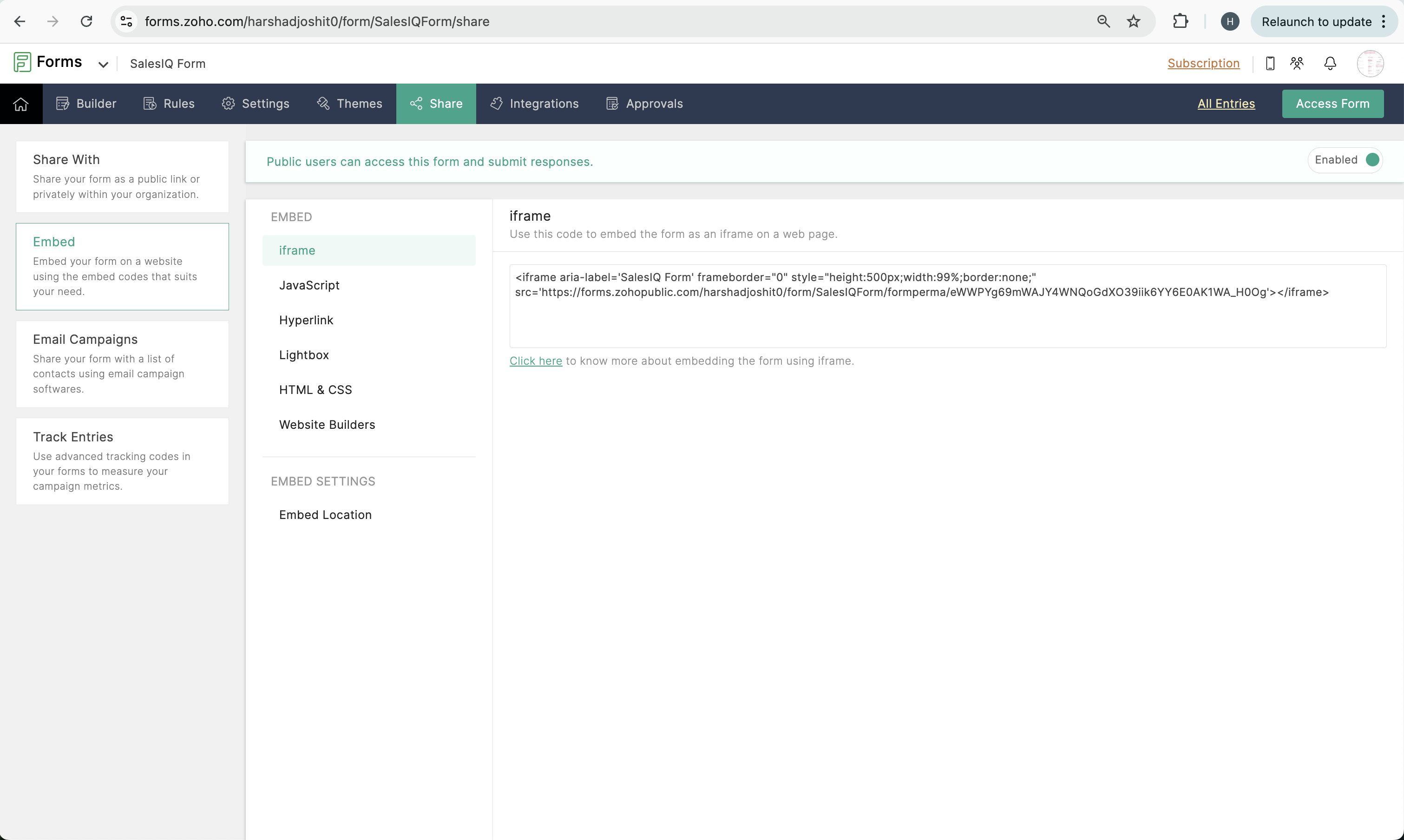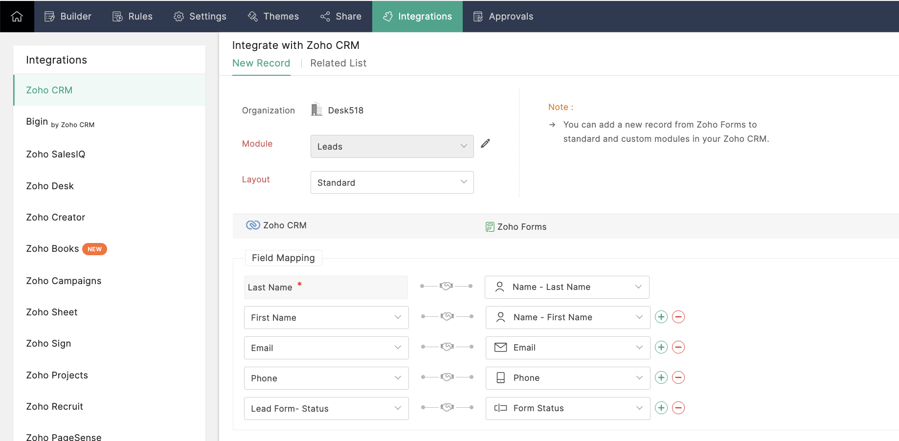 The user is required to make an integration for the created form with Zoho CRM to push entries.