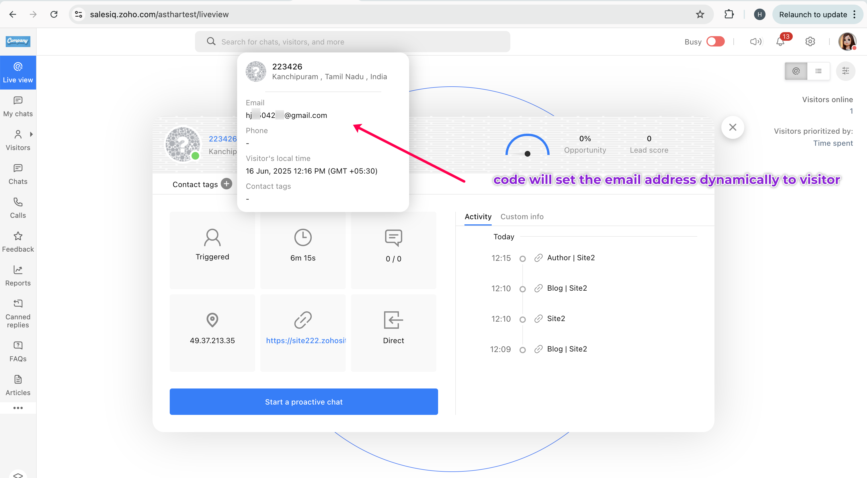Code Explanation: The above code will fetch logged-in user's email address and set the email address dynamically to the website visitor (who signs-up). By this way, visitor basic details (i.e., email) will be identified in Zoho SalesIQ and will be pushed further to Zoho CRM.