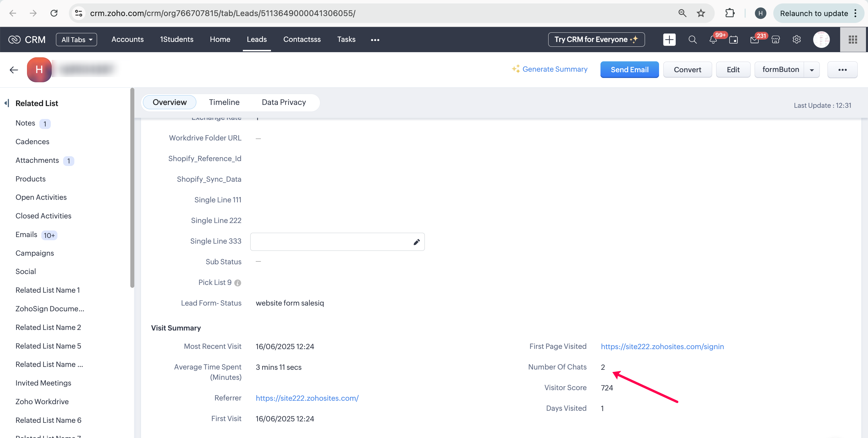 Scenario1 (form submission): A visitor visits the website and submits the form, then lead record will get created in CRM (with website form as value), so that configured workflow will be triggered. Here, 'Number of Chats' will be 0 as visitor not interacted.