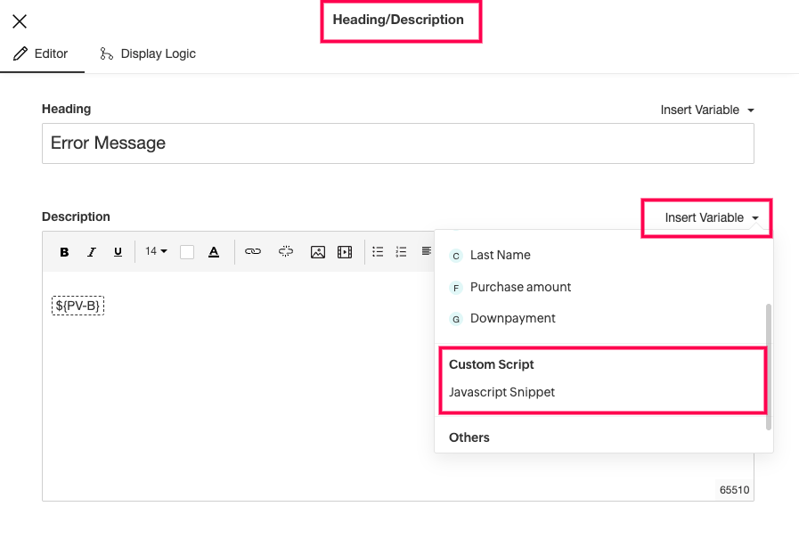 3) Drag and drop the Heading/Description question to display an error message whenever the Down Payment value is less than 10% of the Purchase Amount.