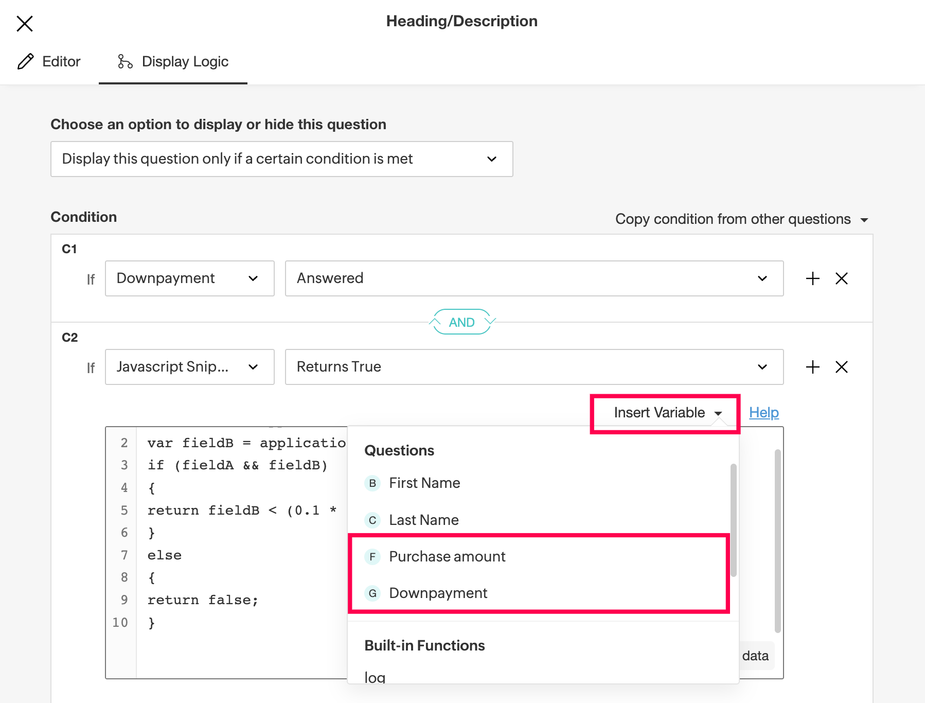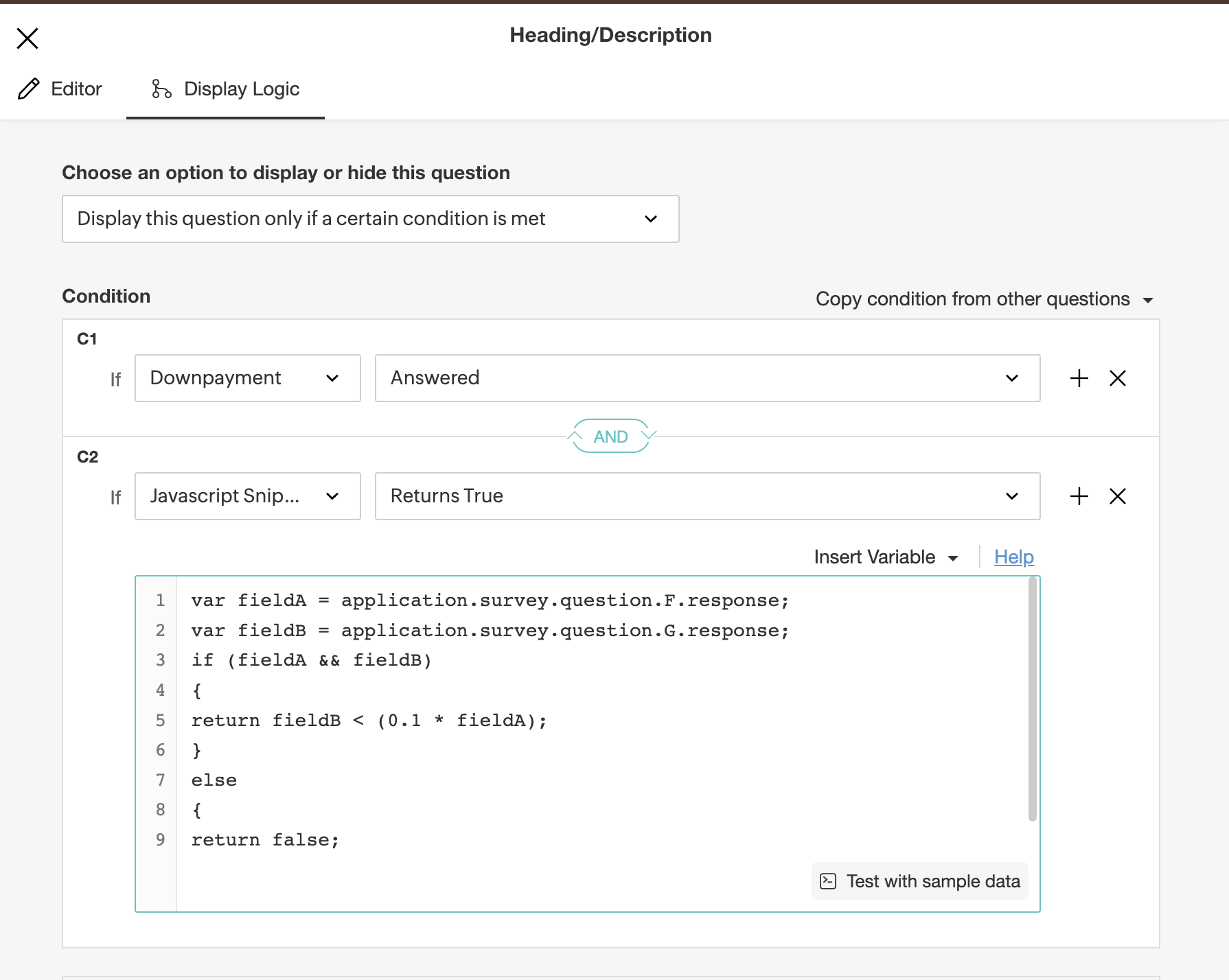 If the condition C2 is true, then it will display the Heading/Description question. Else, it will not display the Heading/Description question.