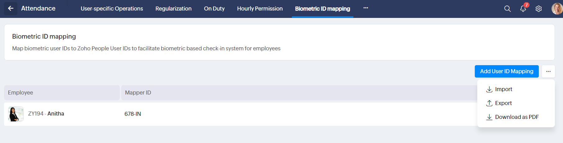 Once you have successfully configured and setup biometric devices for employee check-in and check-out, you can perform ID mapping to link the device's mapper ID to Zoho People's employee ID. This enables seamless biometric device-based secure check-in and check-out for all of your employees.
