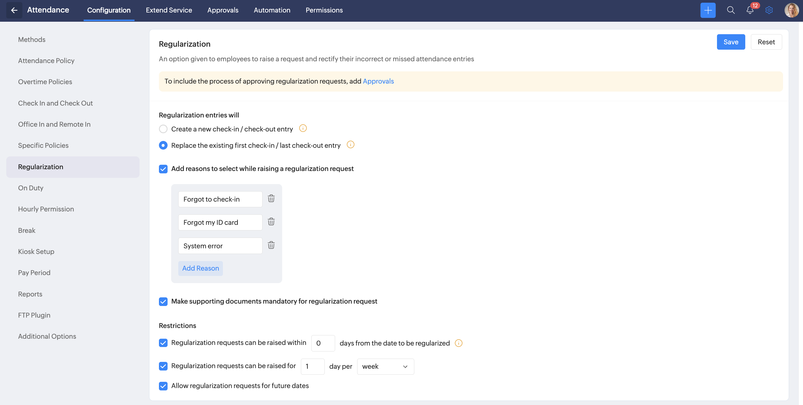 To configure attendance regularization, navigate to Settings > Attendance > Configuration > Regularization.