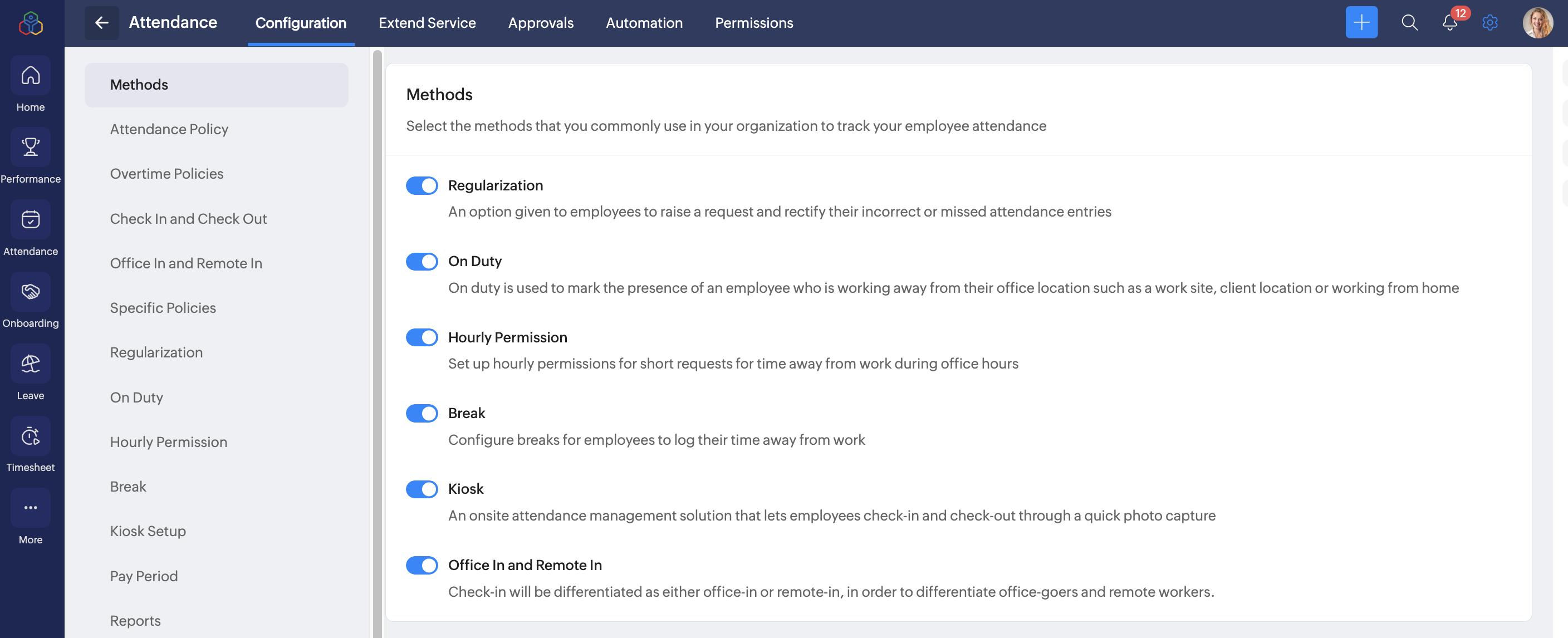 To enable attandance Regularization, navigate to Settings > Attendance > Configuration > Methods. Enable Regularization.