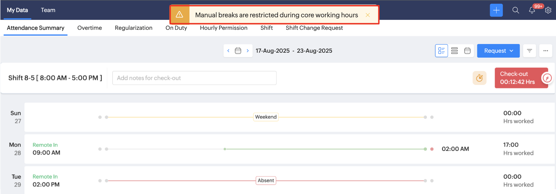 - If employees try to manually start a break during core working hours, an error message will appear, and the system will not allow them to begin the break.
