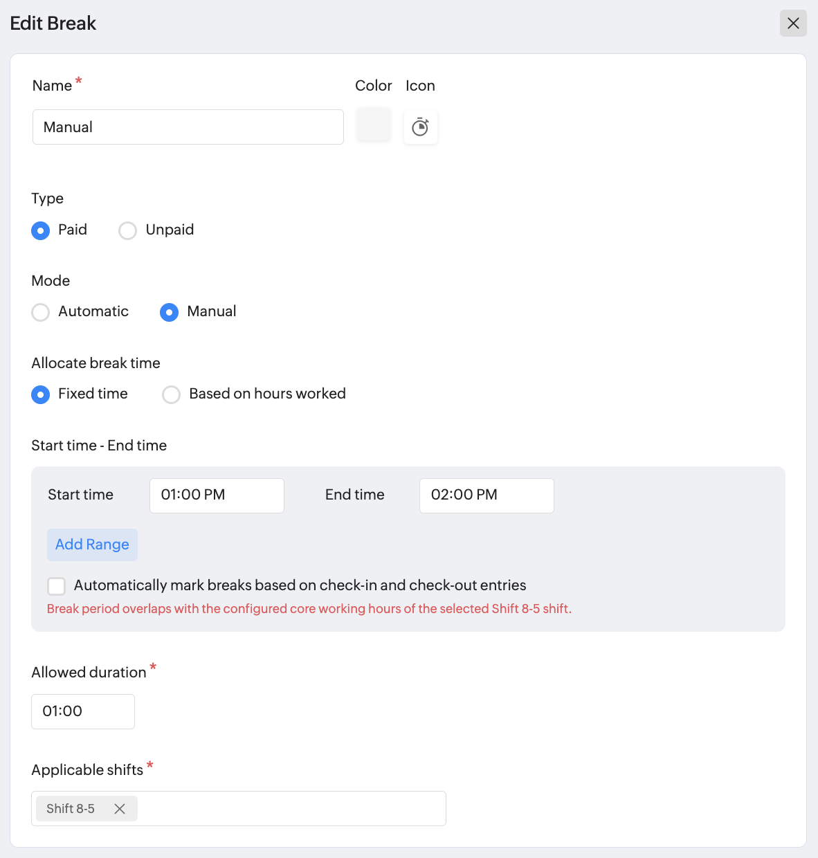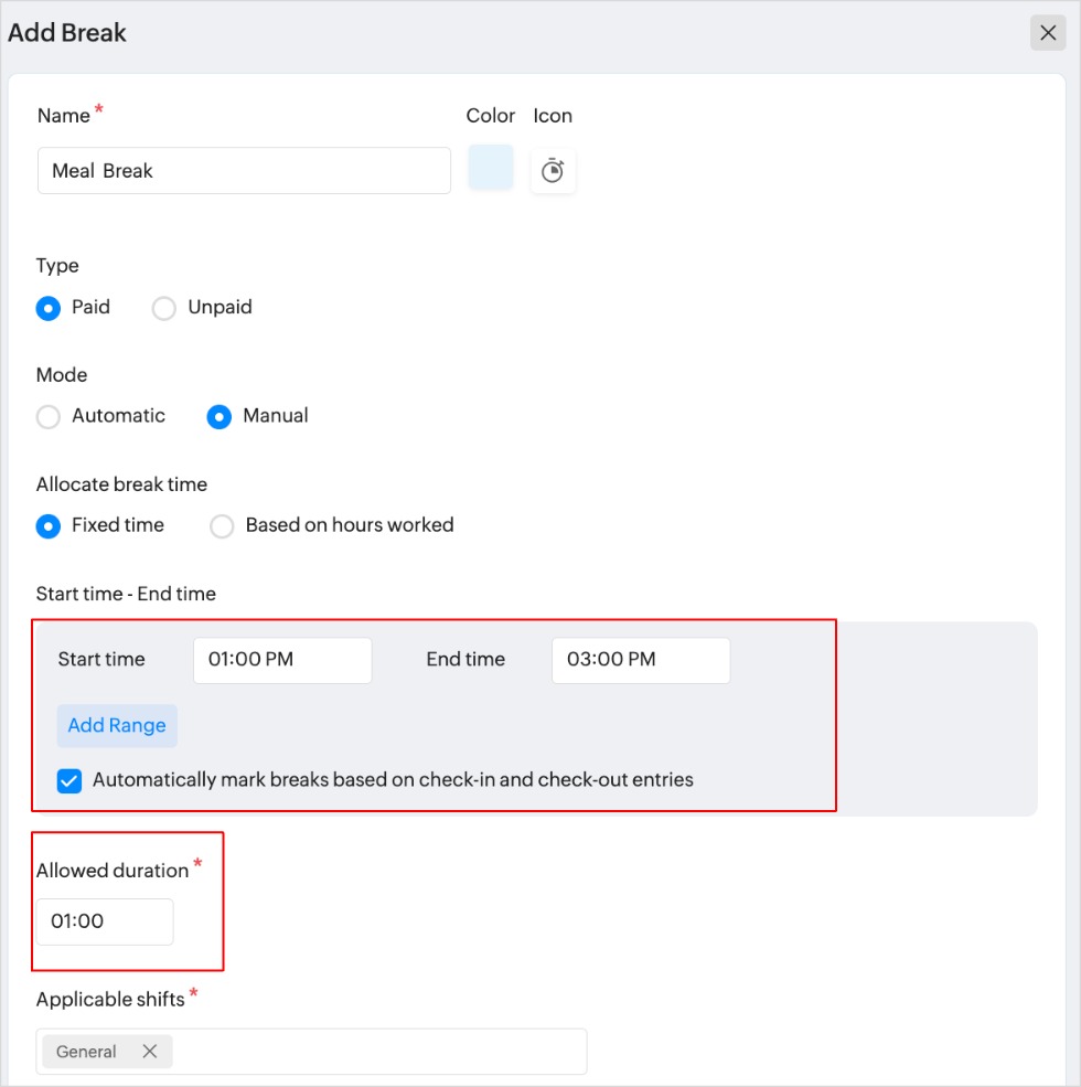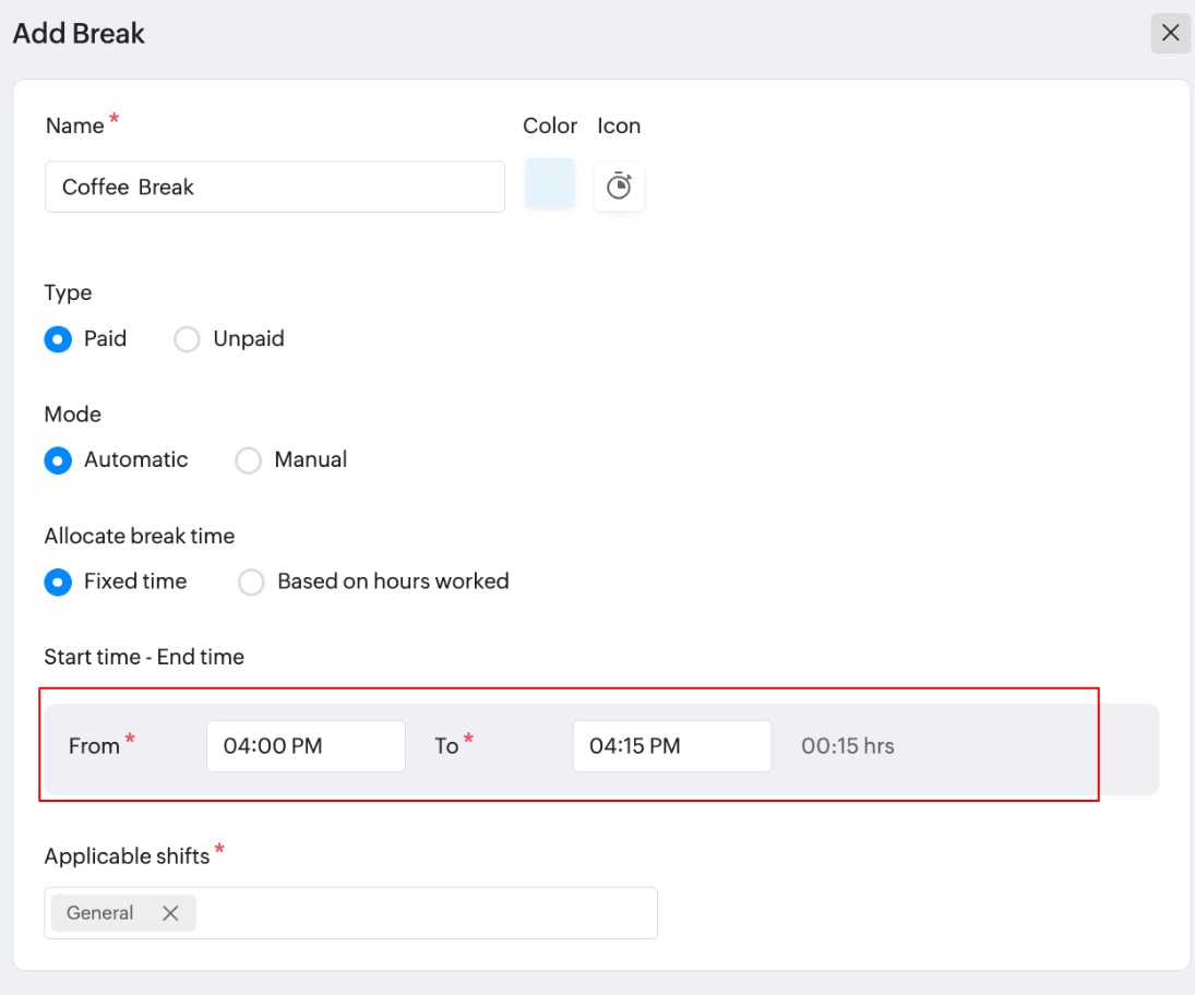 1. For Automatic Break (Fixed time): The selected interval will be logged as break time, For example, if you set the start time as 12:30 PM and end time as 1:30 PM, the break time will be one hour which will be logged during the work shift hours.