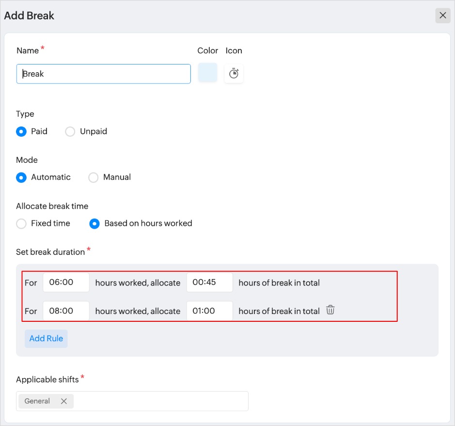 You can set up breaks with a fixed duration for a shift or allocate break time based on employees' work hours within the shift.
