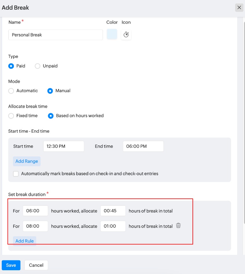 2. Based on hours worked: Allows you to set up break times based on the employee's work hours. Break times will be credited at the end of the worked hours and can be logged by employees. For example, you can configure such as, employee works for 6 hours, a 45-minute break will be credited, and if they work for 8 hours, a 1-hour break will be credited in total.