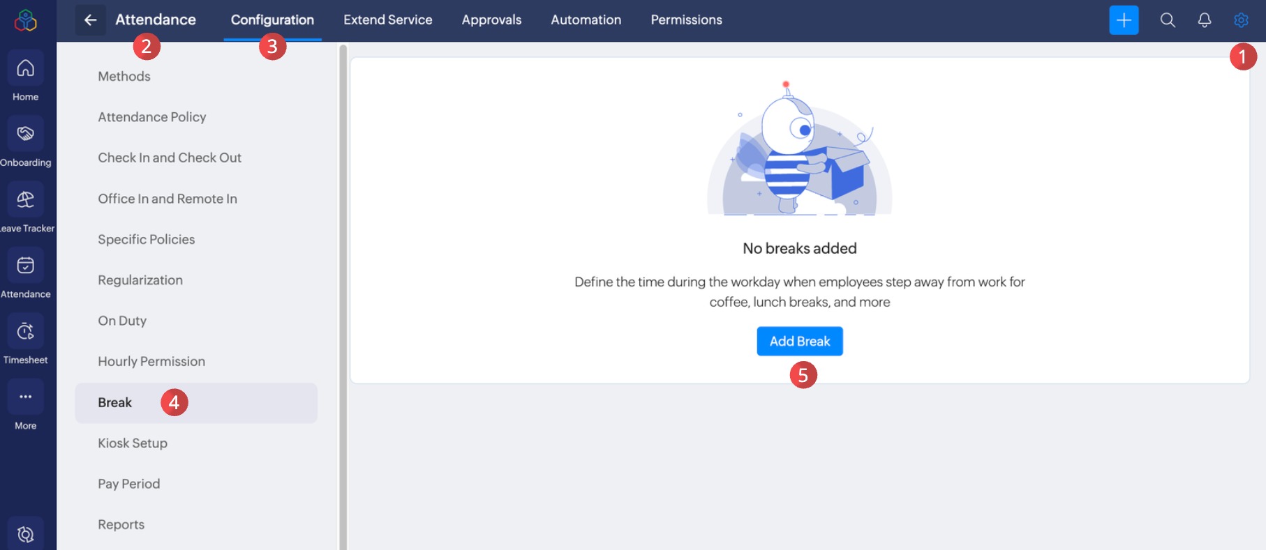 1. From your home page, Navigate to Settings > Attendance > Configuration > Break. Click on Add Break.