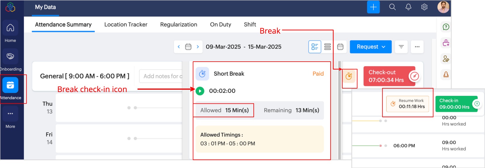 3. Based on the allowed timing, employees can manually log their allowed break duration by clicking the Start icon and the Resume Work button.