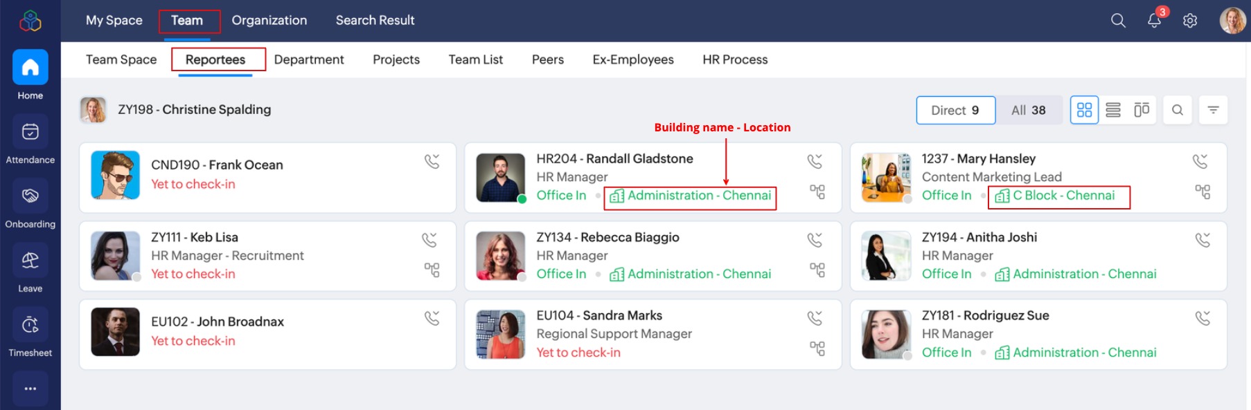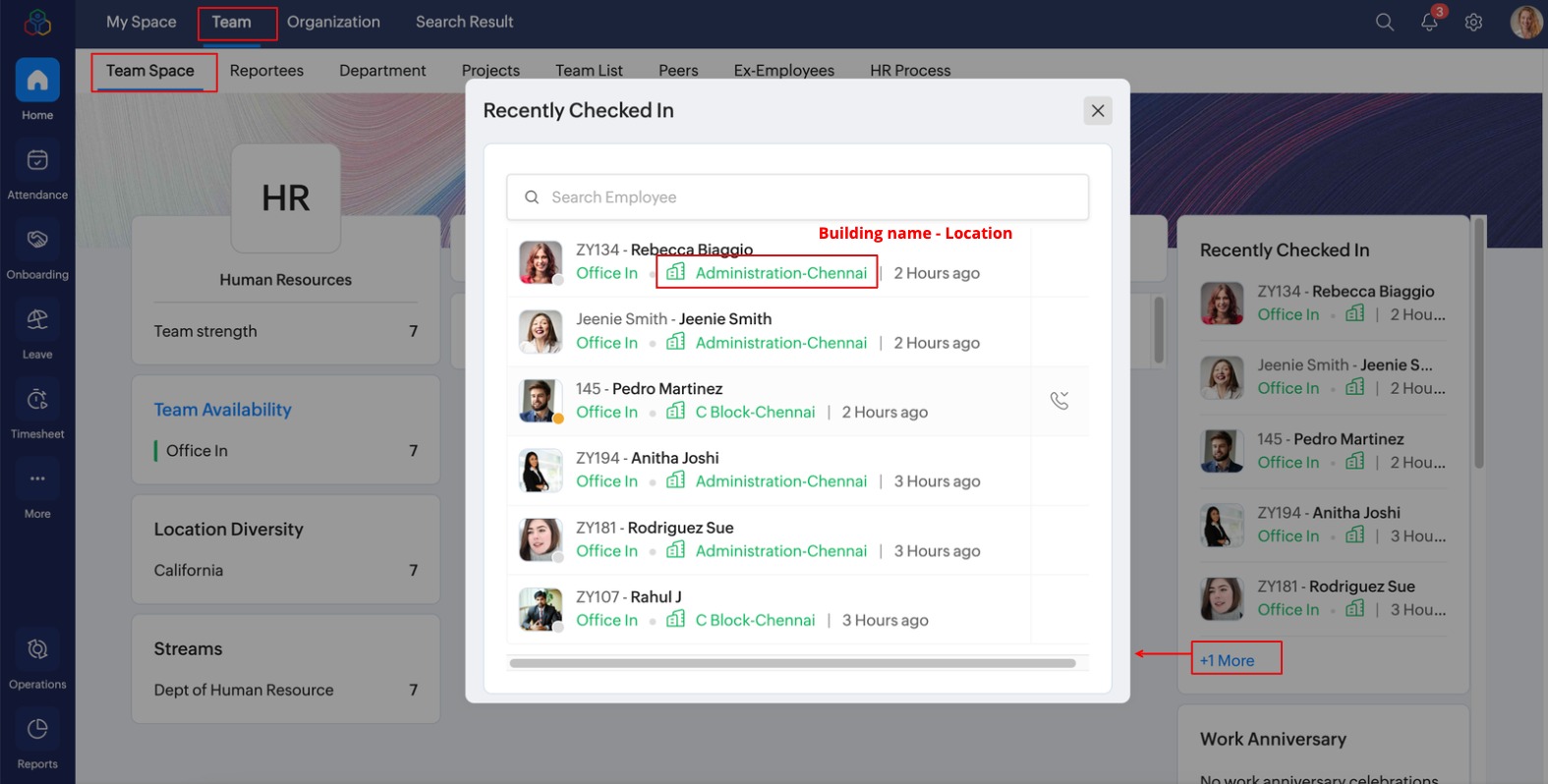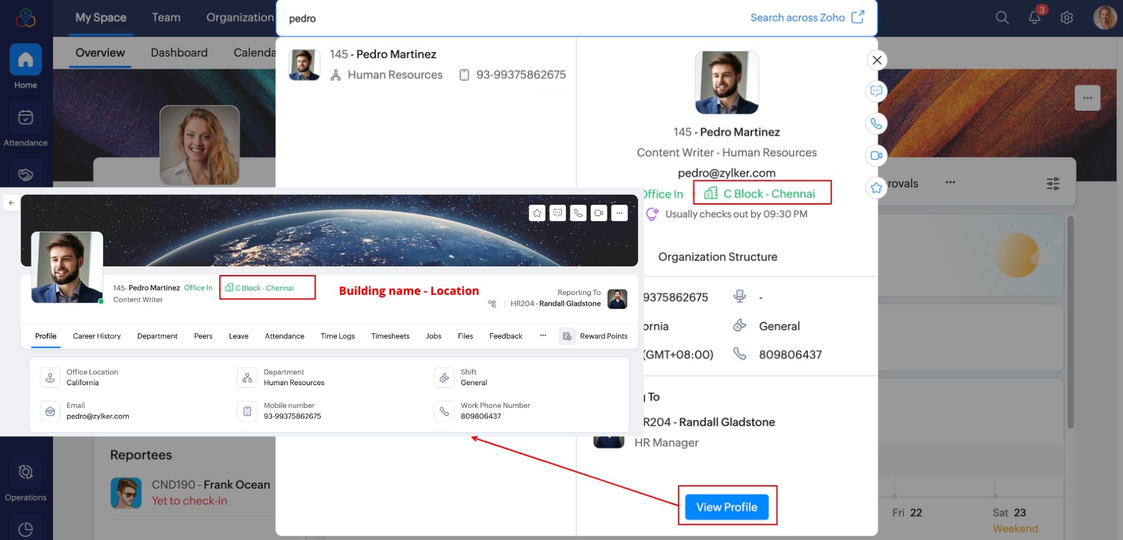 In Zoho People the employees work building name and location information are displayed in the following user interfaces: