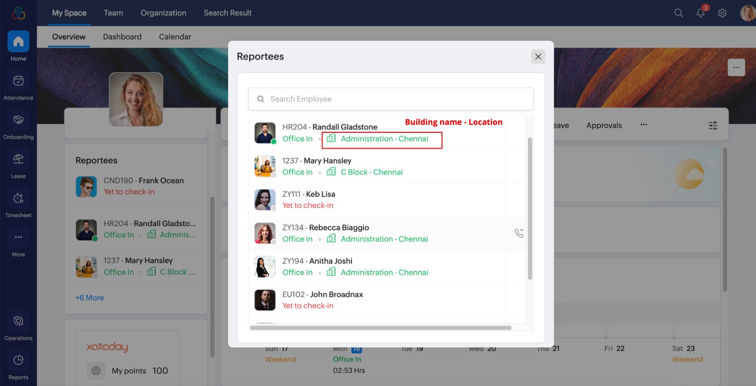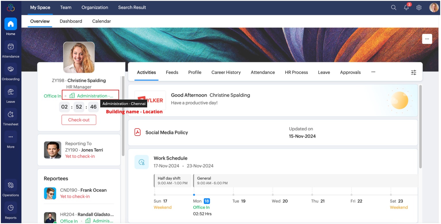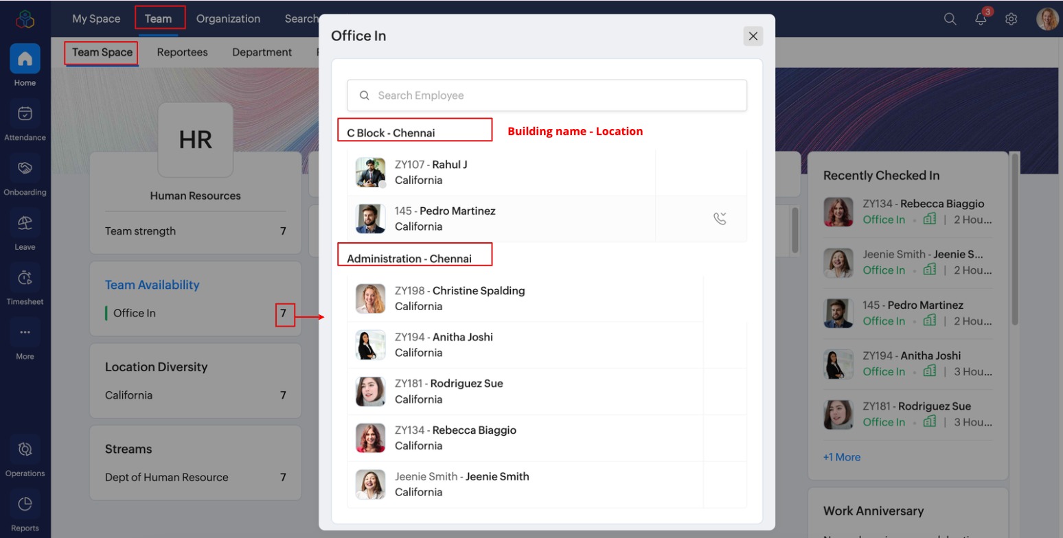 In Zoho People the employees work building name and location information are displayed in the following user interfaces: