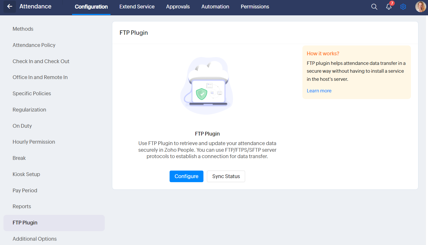 The FTP plugin in Zoho People simplifies sharing your attendance data. This secure solution lets you easily transfer attendance files without installing any additional software on your host's server.  Focus on managing your workforce and let Zoho People handle the secure transfer of your critical attendance information.