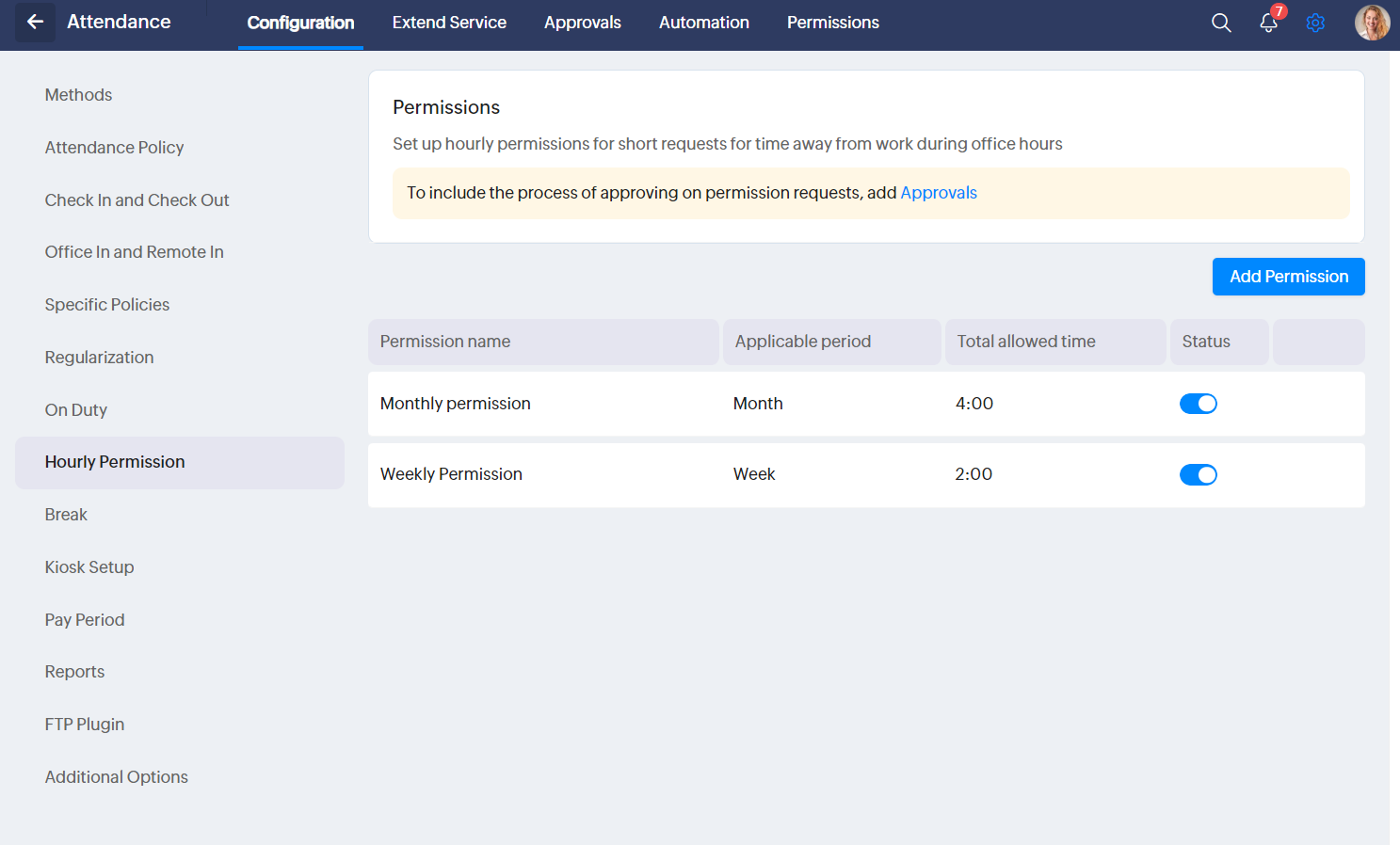 To enable hourly permission, navigate to Settings Attendance Configuration > Methods. Enable Hourly Permission.