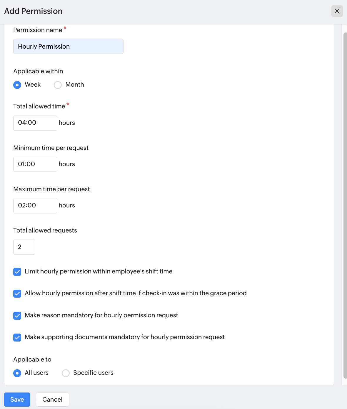 7. If requests are to be made within the employee's shift timings only, enable Limit hourly permission within employees shift time.