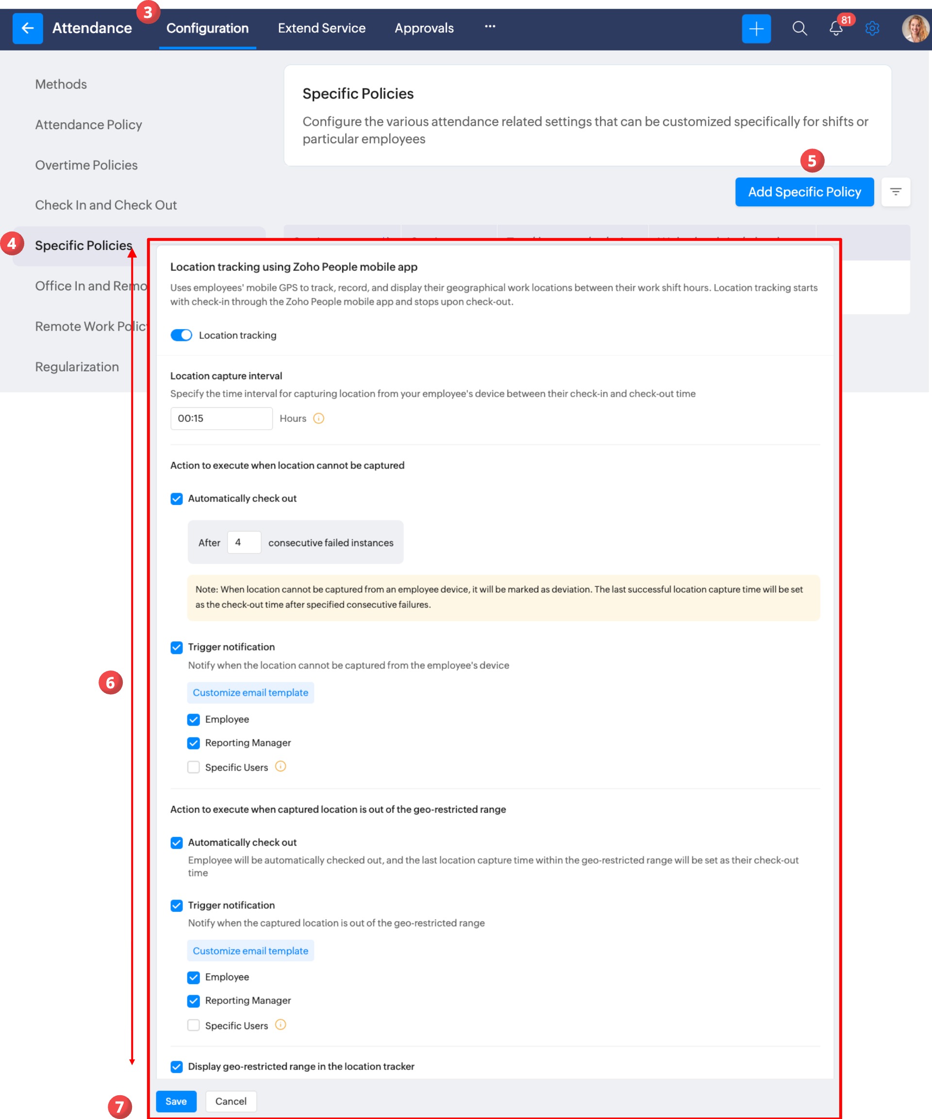 1. An administrator enables the Location Tracking feature in a specific attendance policy of Zoho People in web application.