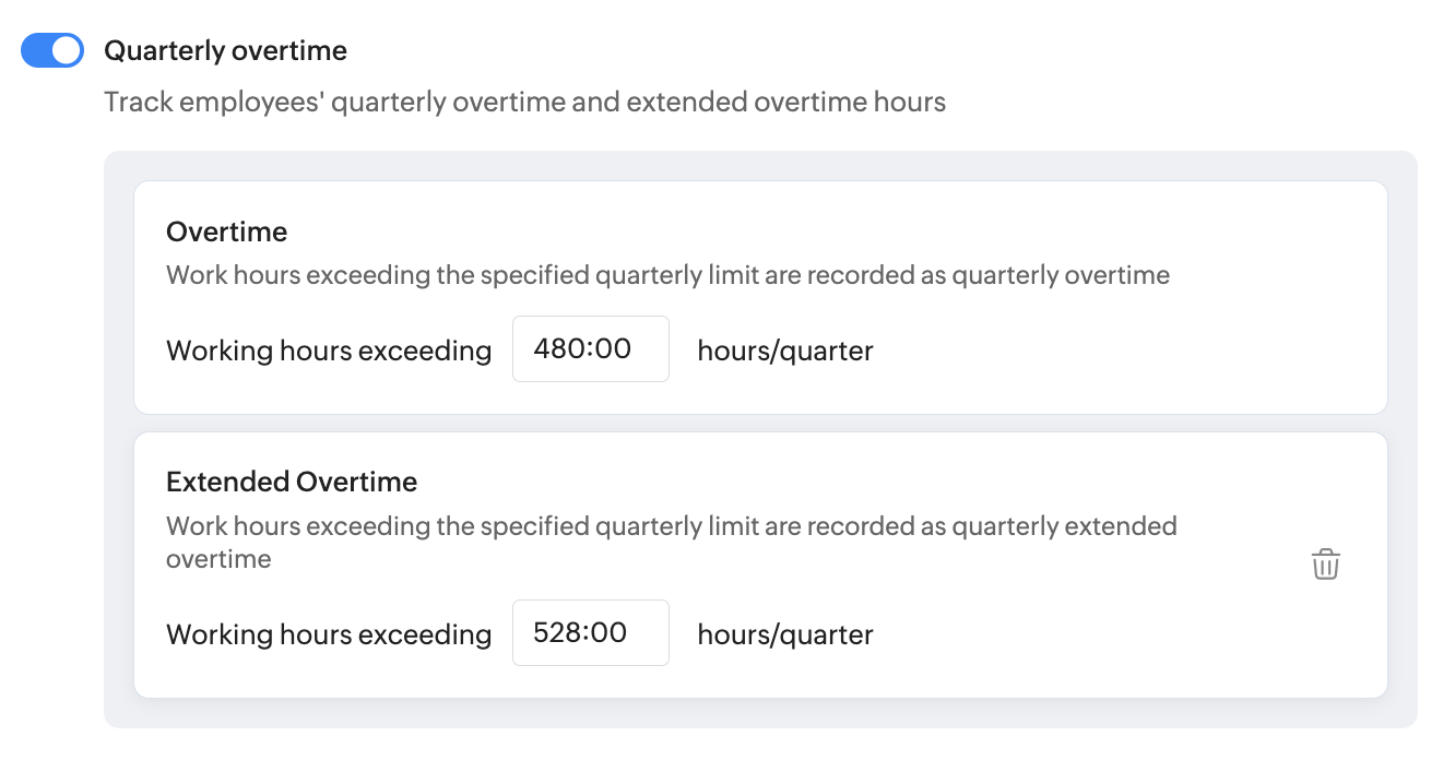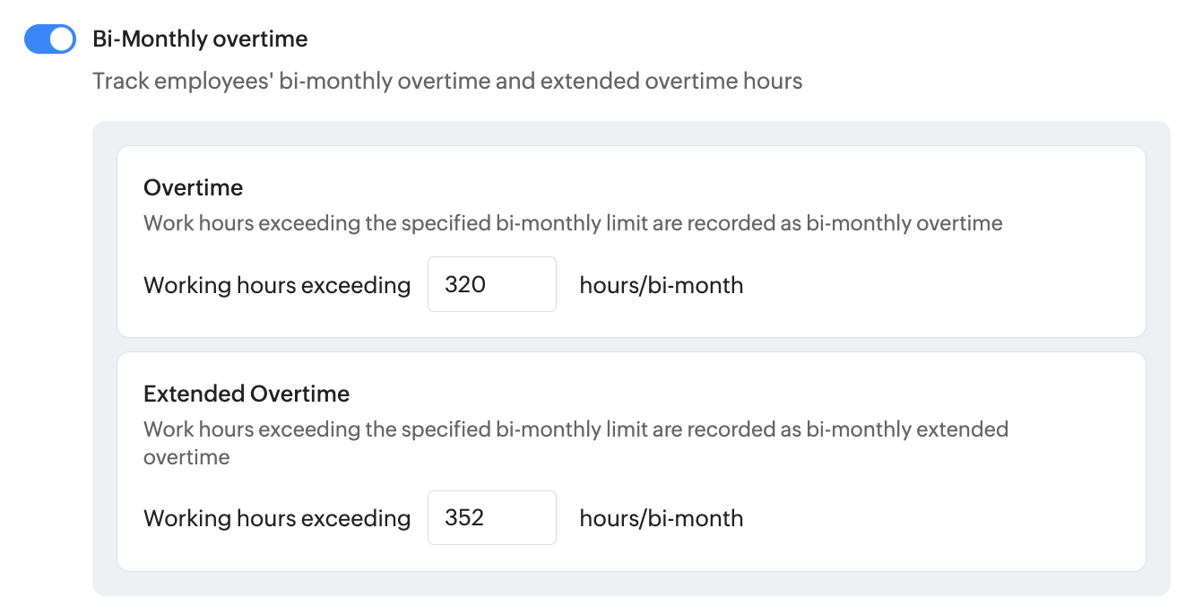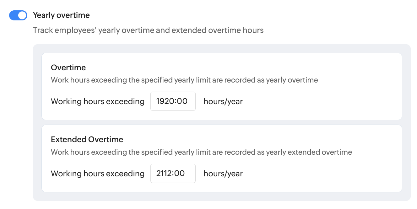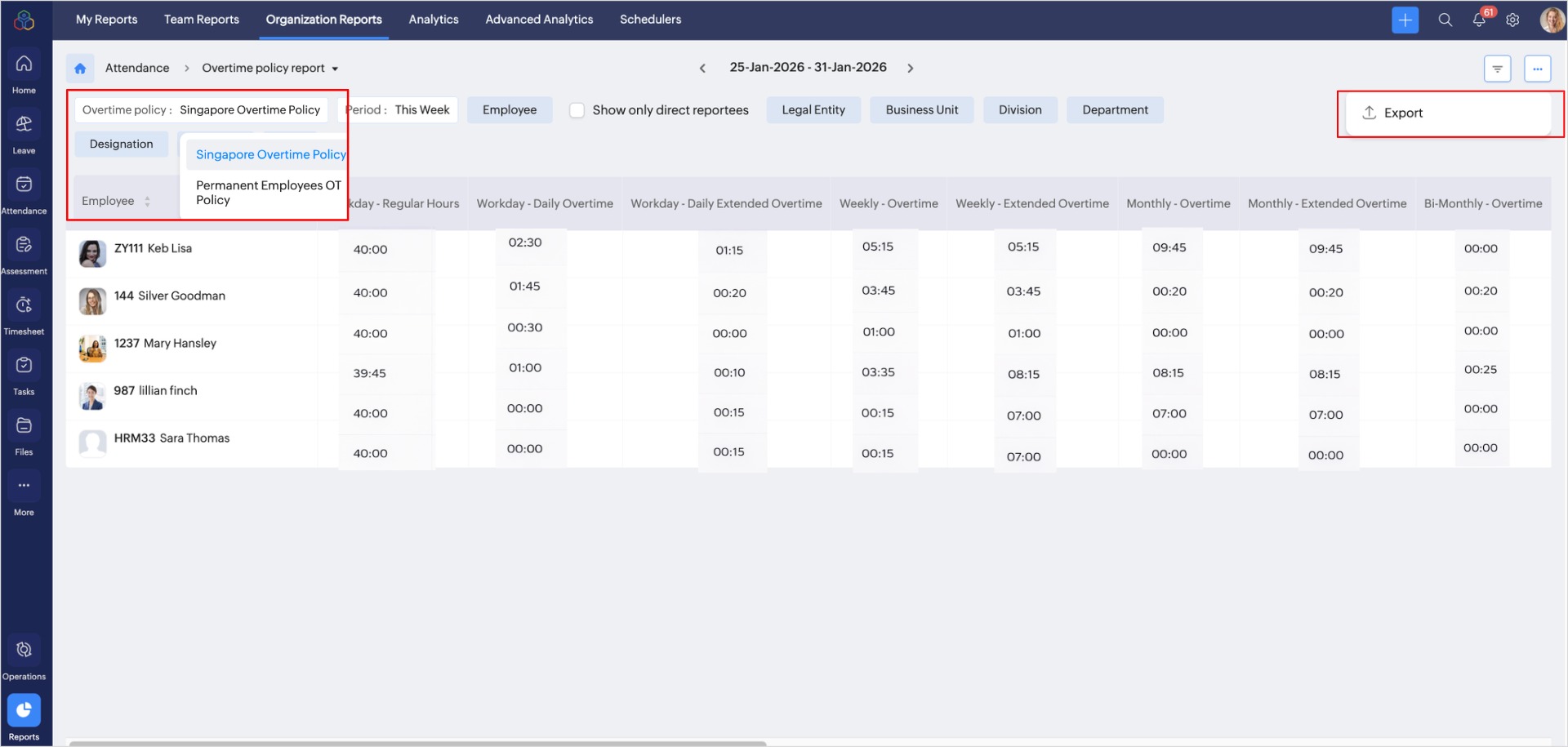 When the expected work hours for a day is greater the configured overtime limit, the system calculates overtime only for the hours worked beyond the organization’s expected work hours.If you are adding the overtime policy from the Japan region, the report name will be 'Article 36 of the Labor Standards Act,' and you can customize the report headers to match your organizational preferences.