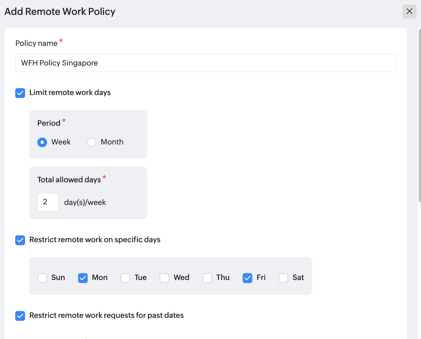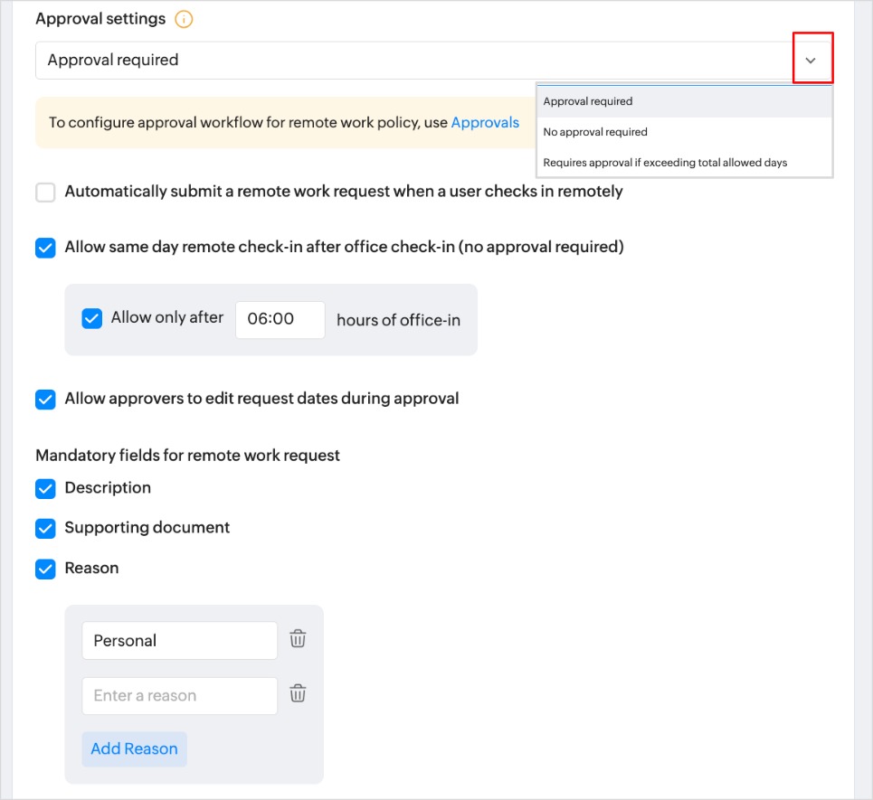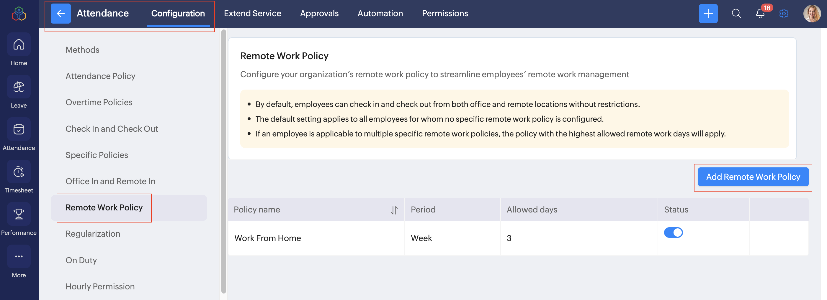 To configure the remote work policy in Zoho People, ensure that the Office In and Remote In settings are enabled under Attendance Methods. For more information, refer to Enable attendance Methods.