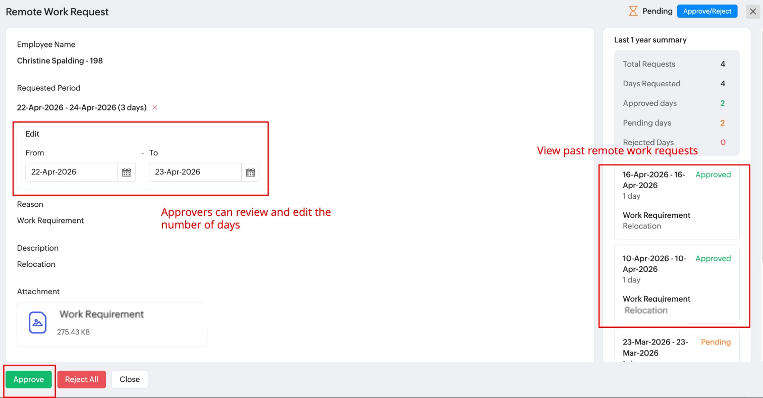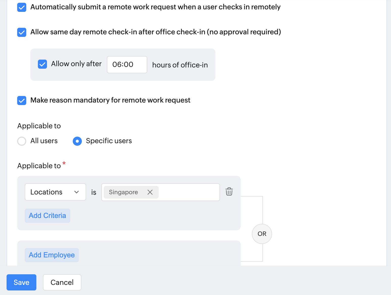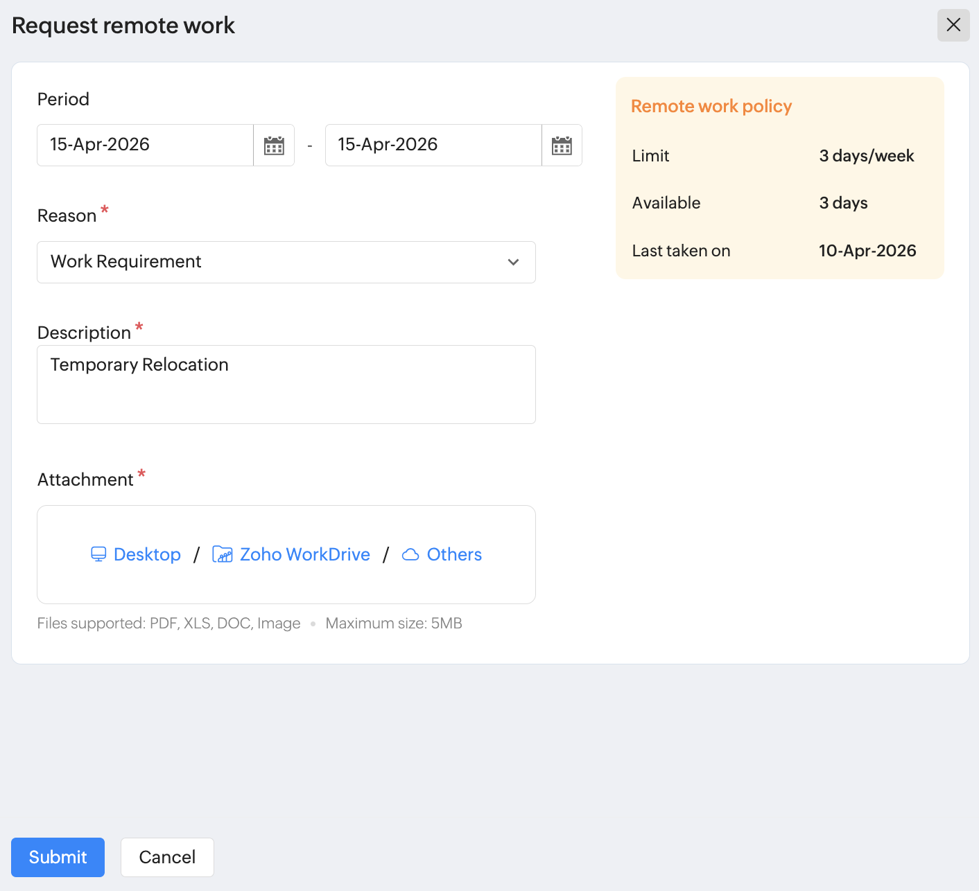 To configure the remote work policy in Zoho People, ensure that the Office In and Remote In settings are enabled under Attendance Methods. For more information, refer to Enable attendance Methods.