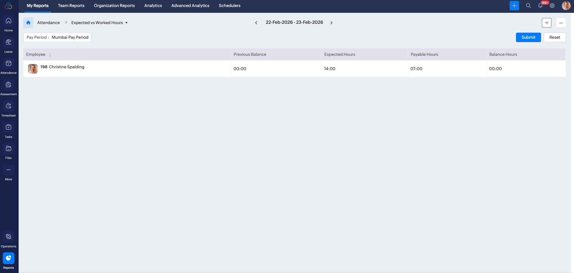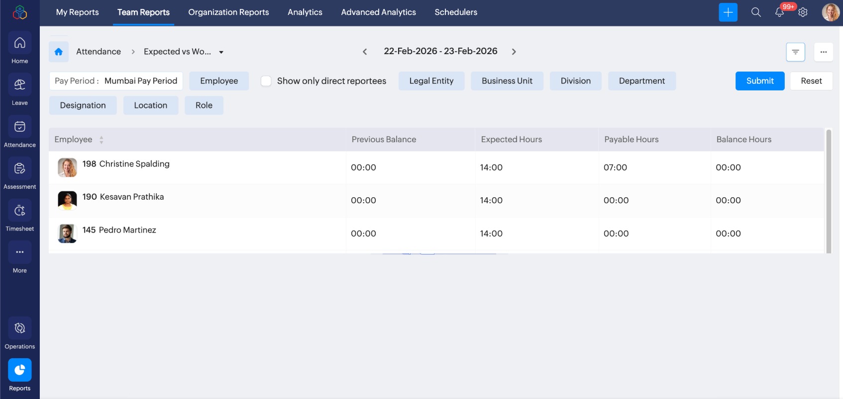 Reporting managers can view and edit their reportees Expected vs Worked Hours report under Reports > Team Report> Attendance > Expected vs Worked Hours.