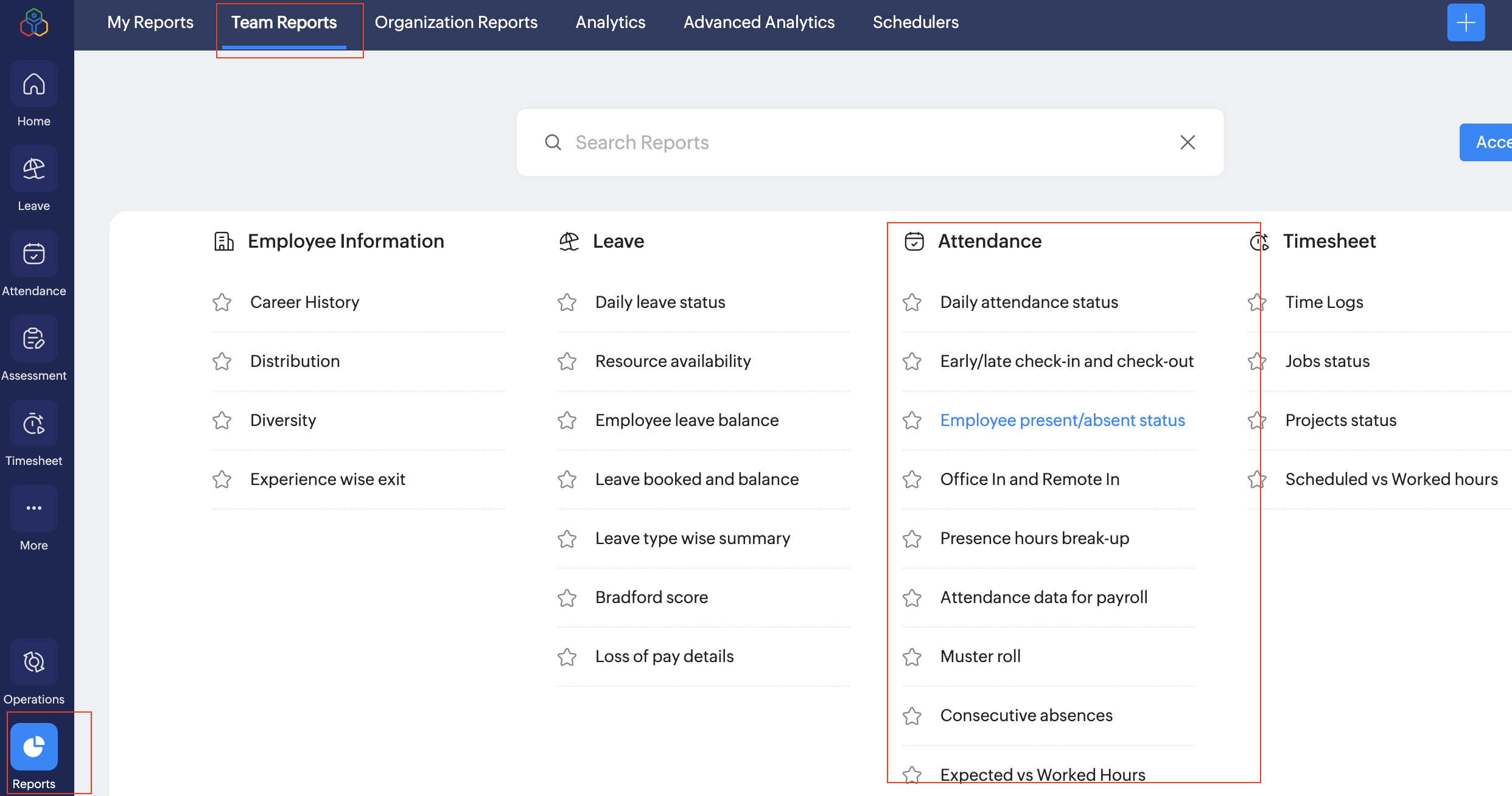 Reporting manager can view their reportees attendance reports under, Reports > Team Reports > Attendance.