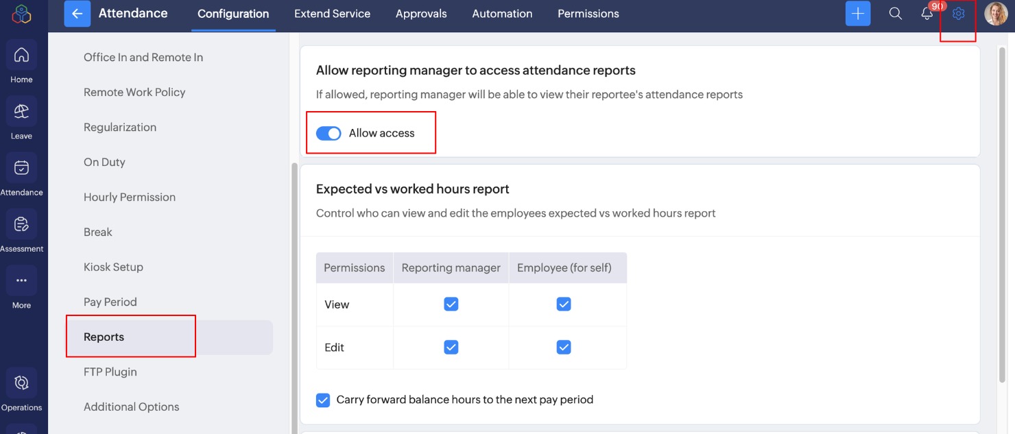 2. Enable Allow access under Allow reporting manager to access attendance reports, to allow allow reporting manager to view their reportees attendance data.