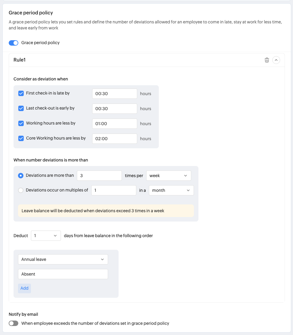 | Thursday | Check-in late by 20 minutes | 0.5 days of vacation leave deducted (casual leave balance lapsed) |