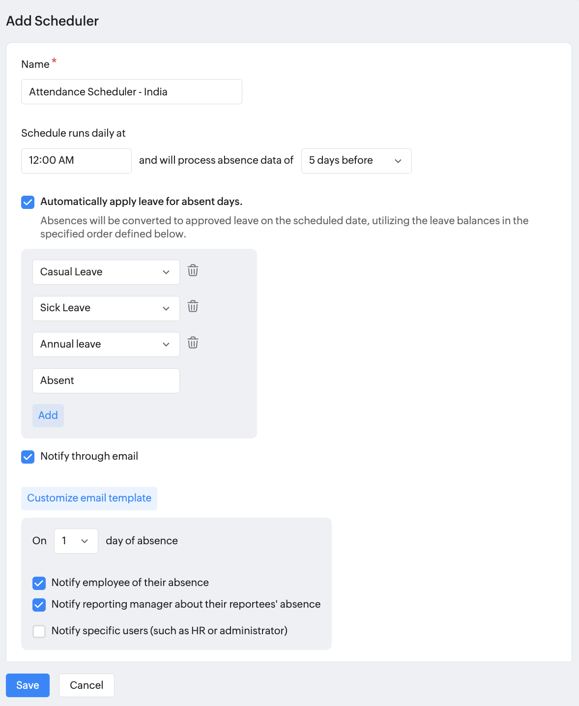 Absent Scheduler | Administrator Guide | Zoho People 5.0 help
