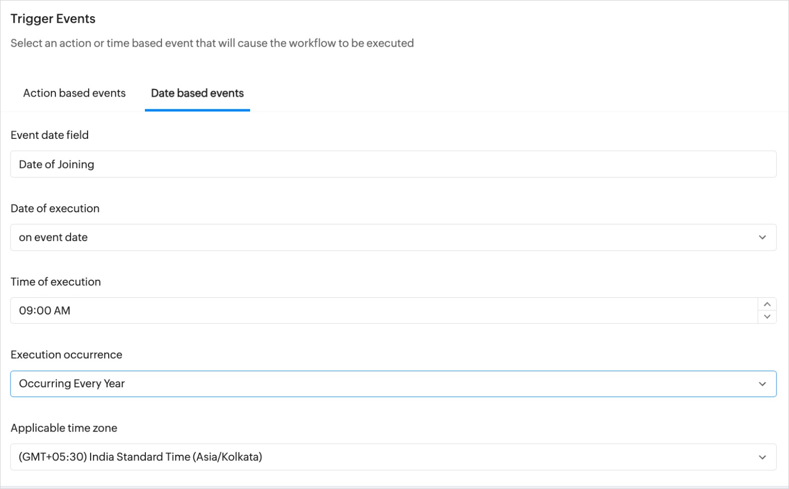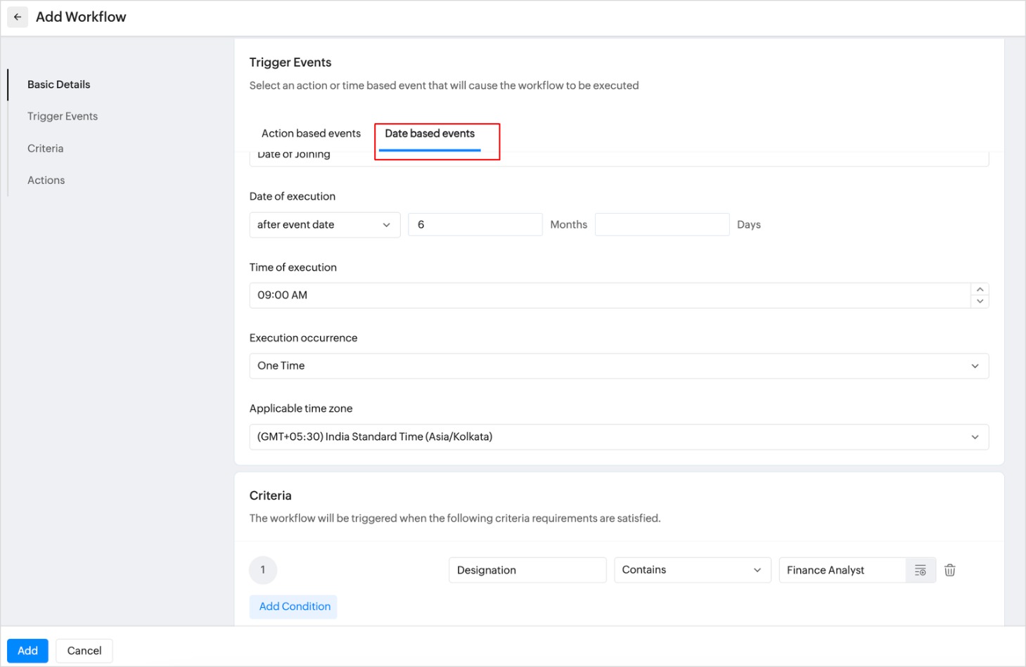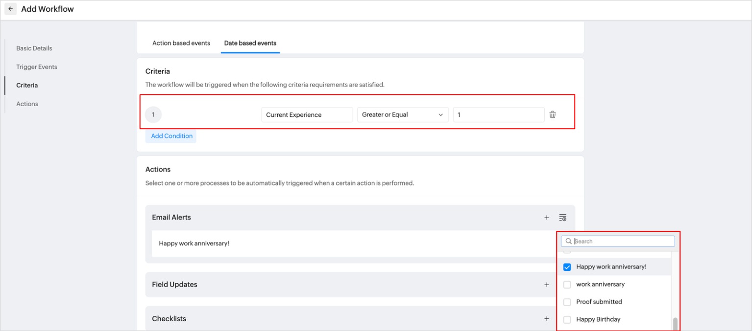 Step 3: Create a workflow with a date-based trigger event. Choose the Date of Joining as the event date, and select the time for execution. Set required criteria, and under actions, select the Welcome Email alert. Finally, click Save.