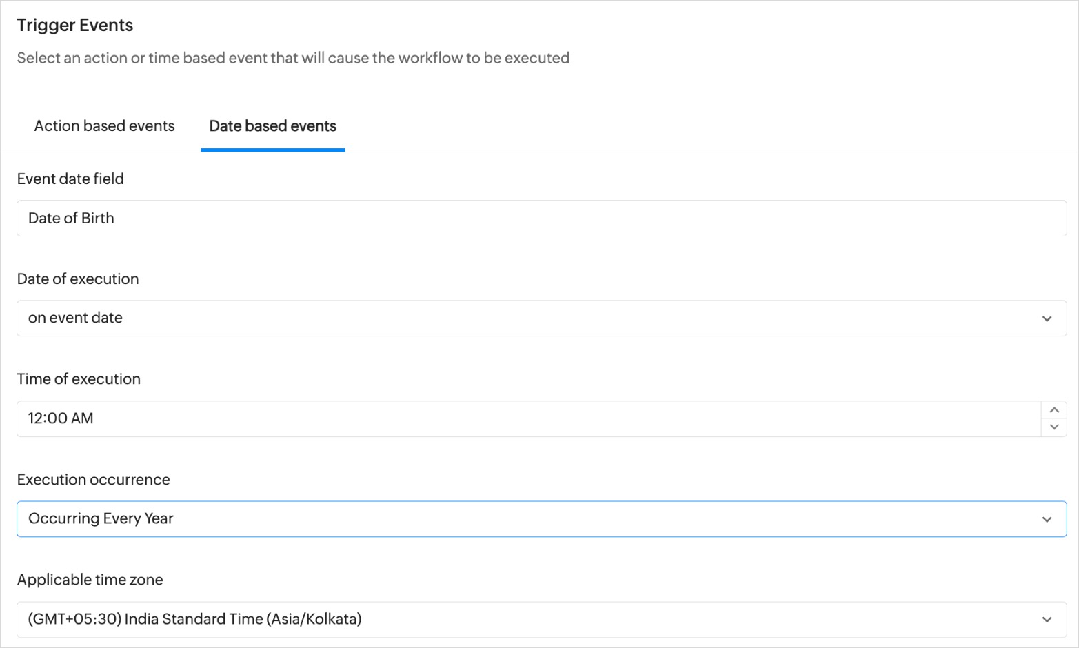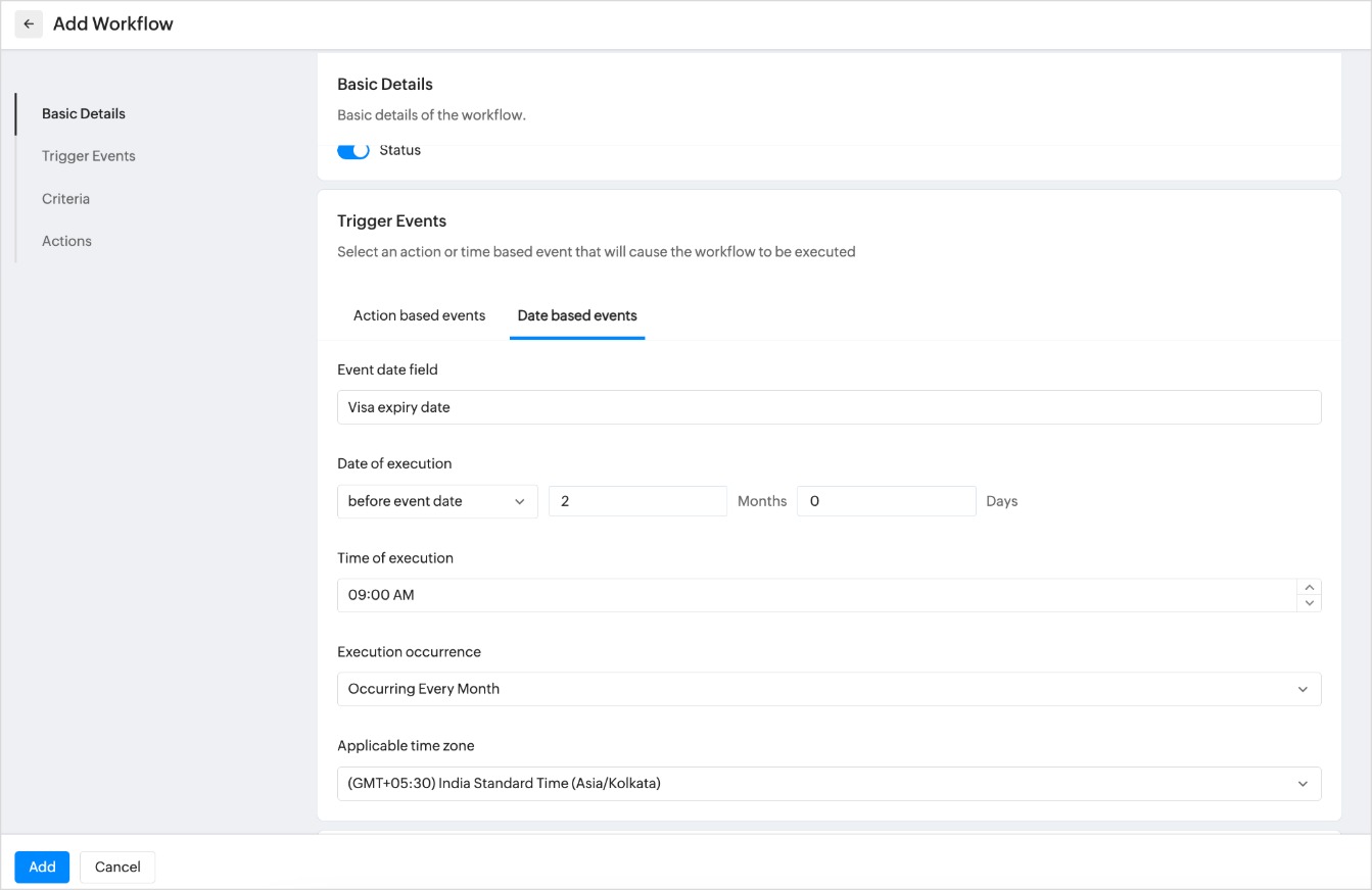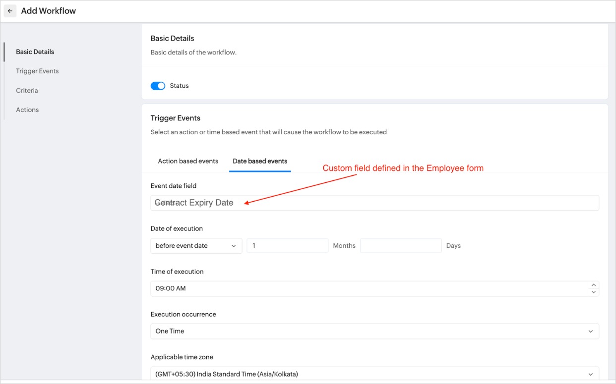 Step 3: Create a workflow with a date-based trigger event. Choose the Date of Joining as the event date, and select the time for execution. Set required criteria, and under actions, select the Welcome Email alert. Finally, click Save.