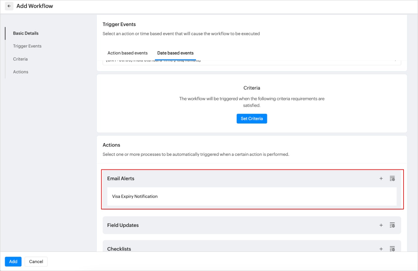 Step 2: Create a Workflow to automatically notify employees before their visa expiry.