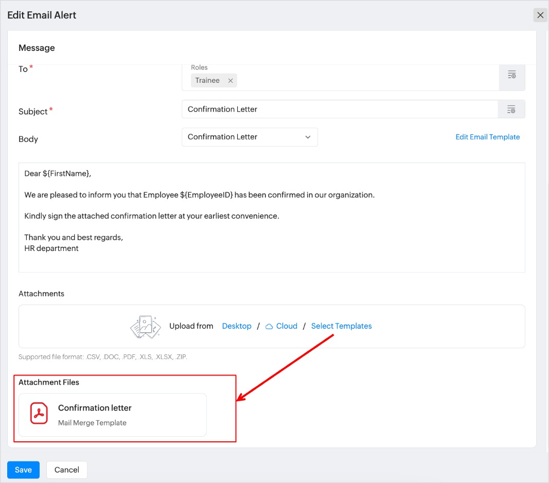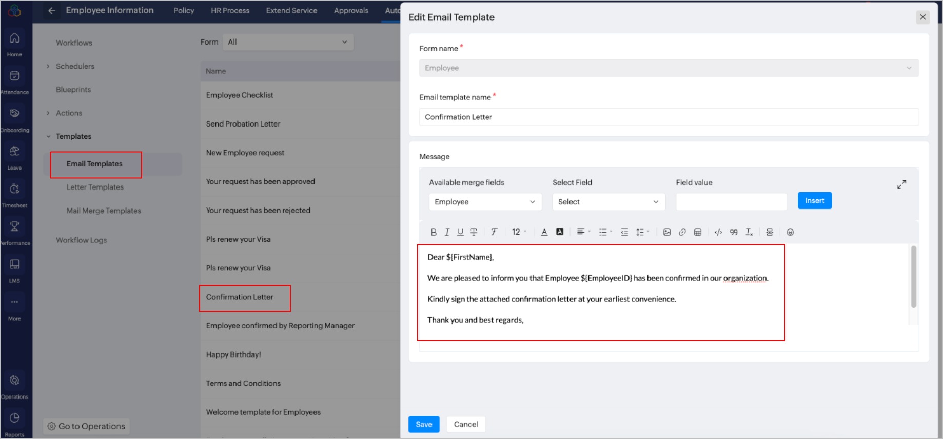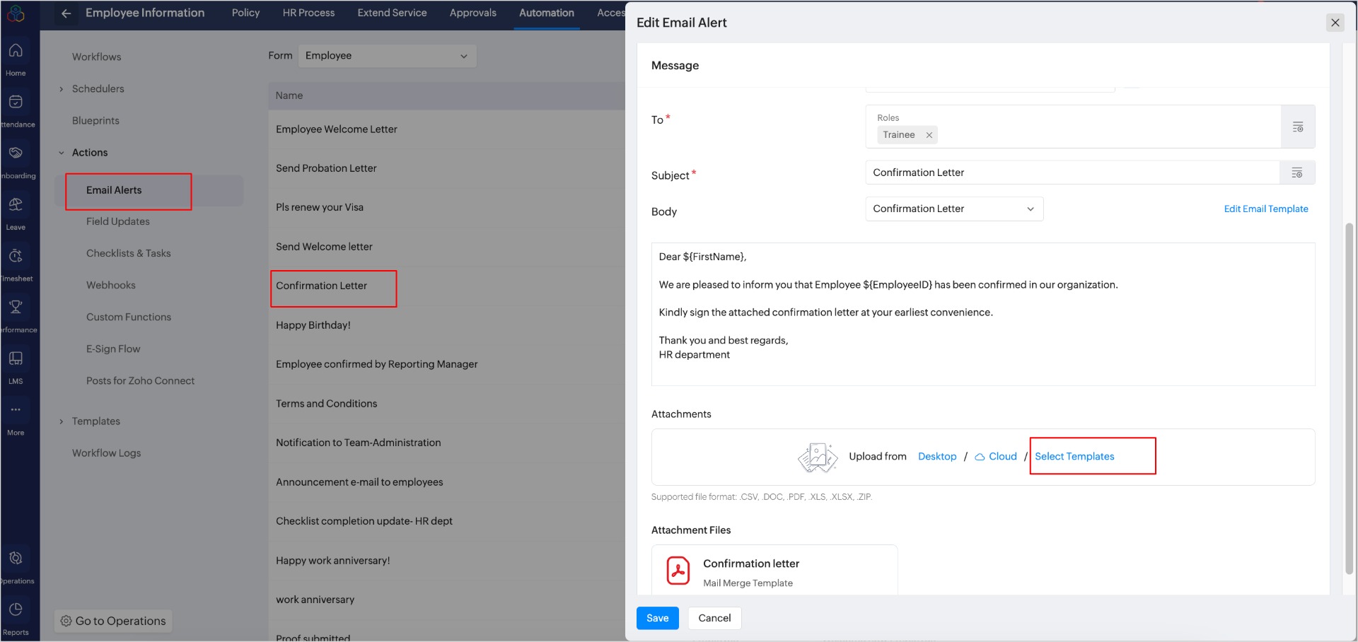 - Use Mail Merge Template option to create a Confirmation letter with advanced formatting options and design, refer to Mail Merge Template - Zoho People.
