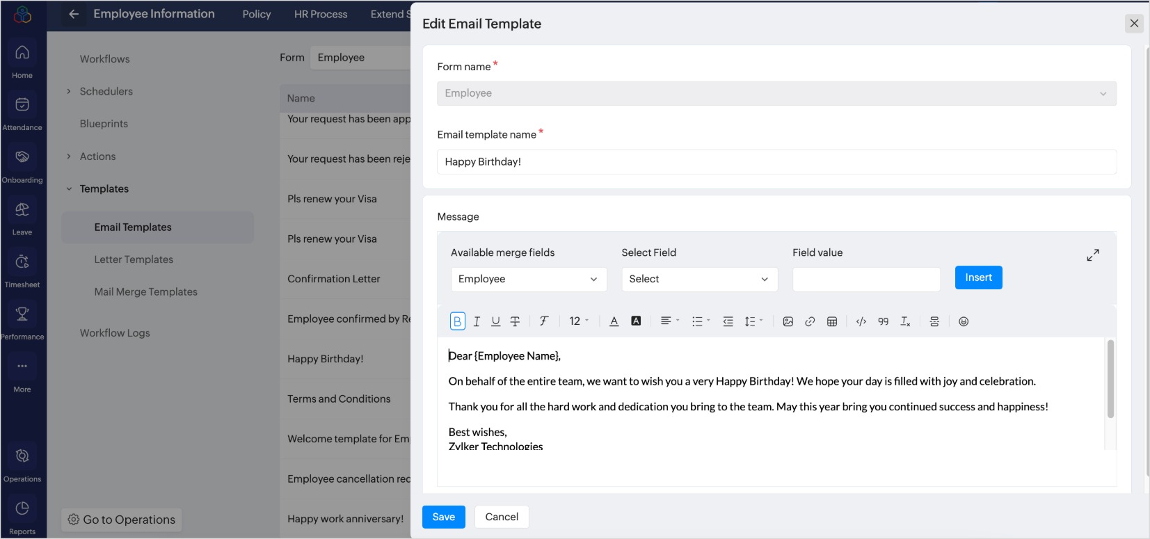 - Create an Email Template for birthday reminder, refer to Email Alerts Automation - Zoho People.