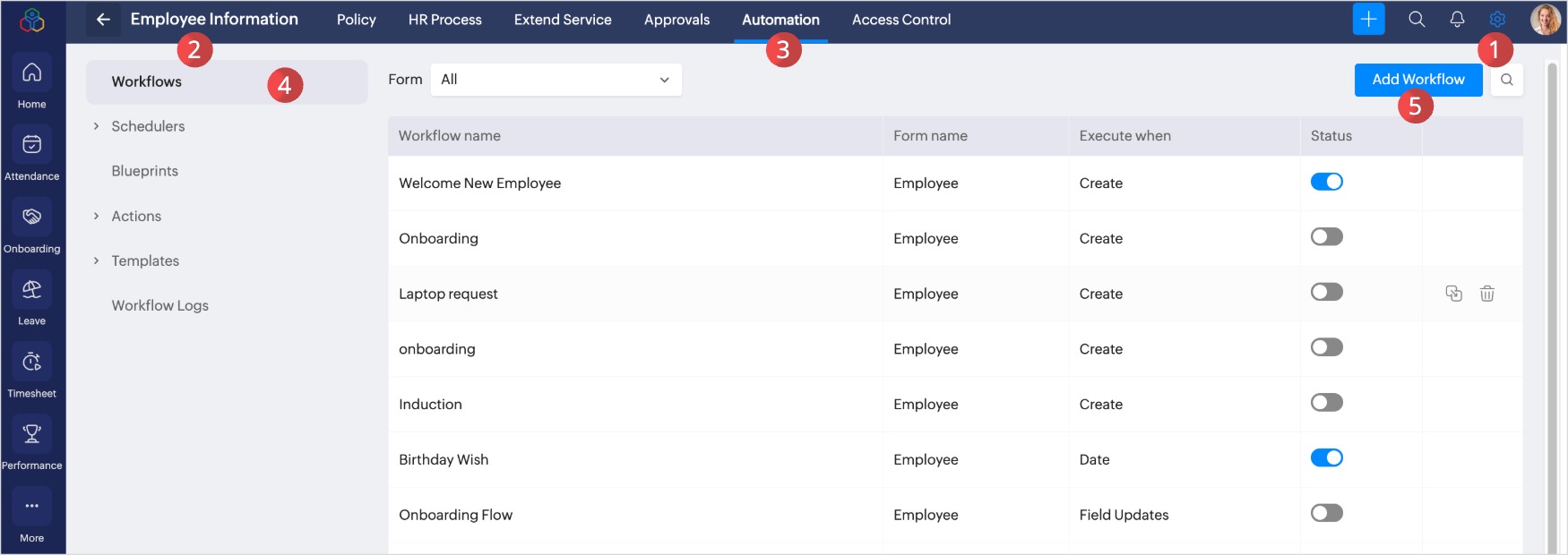 - Navigate to Settings > Employee Information > Automation > Workflows.