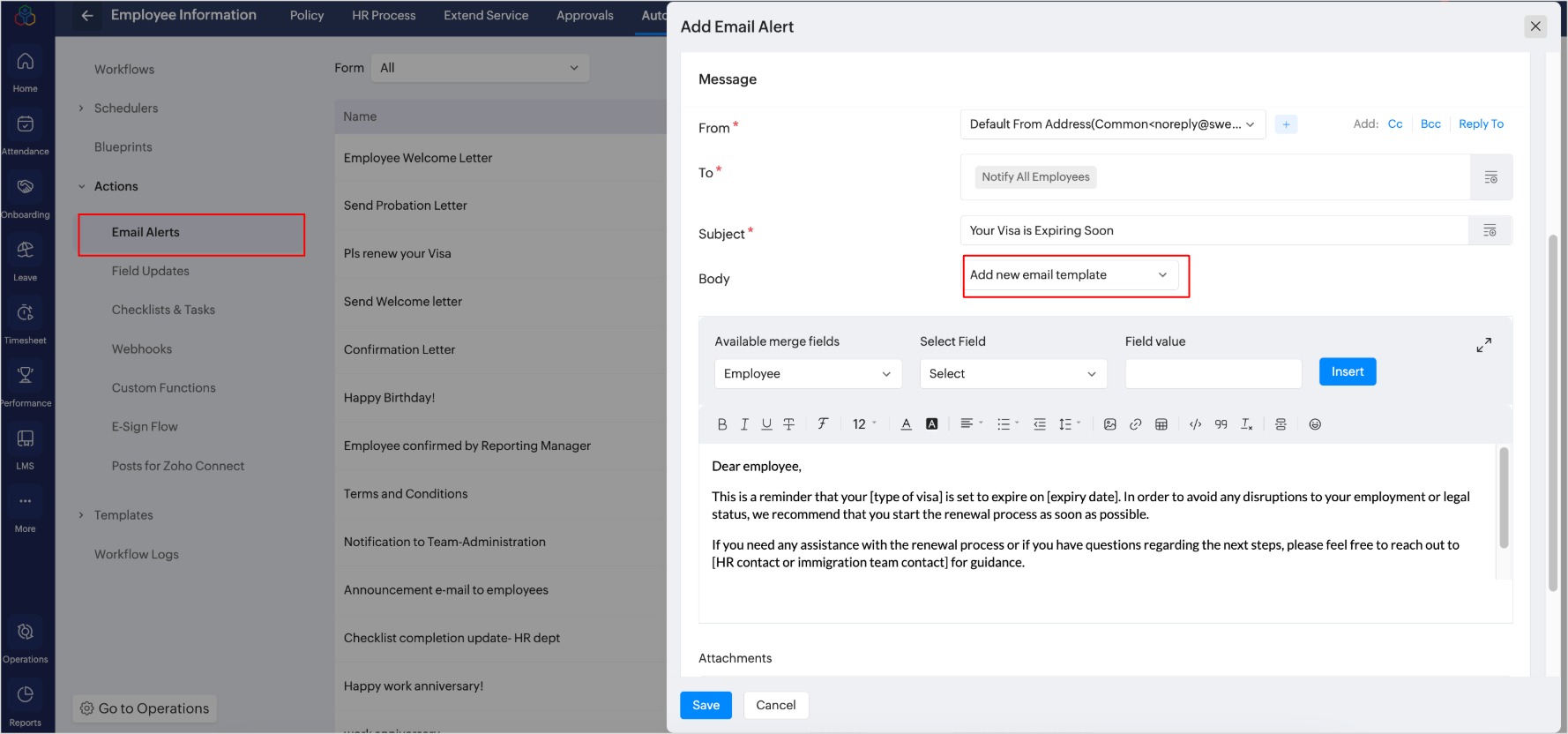 Step 2: Create an Email Alert for employee form,  and associate the above email template, navigate to Setting > Employee Information > Automation > Actions > Email Alerts.