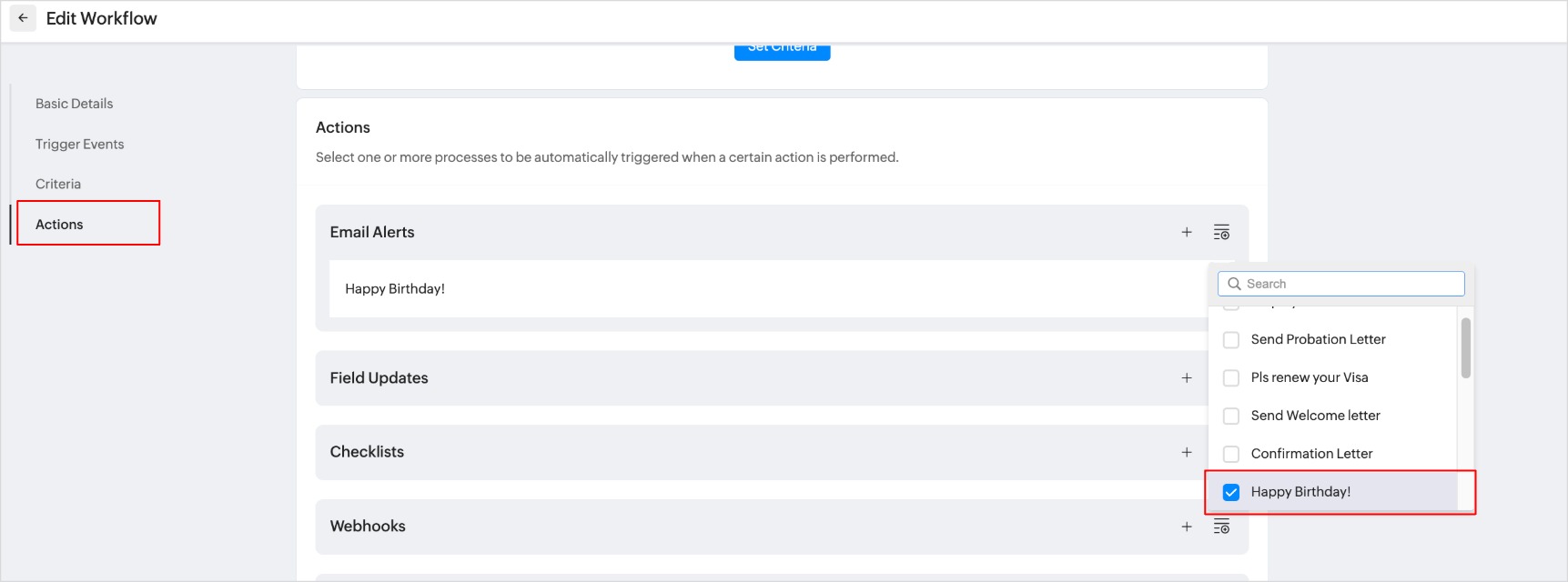 - In the Actions > Email Alerts, select the Email template created for the Birthday reminder.