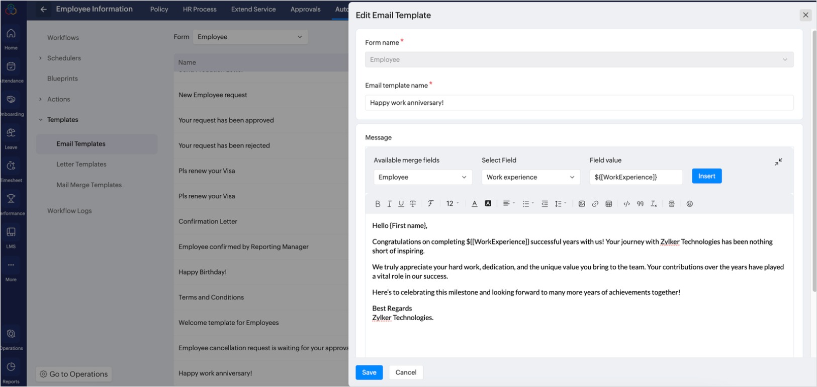 - Create an Email Template for the work anniversary, refer to Email Alerts Automation - Zoho People.